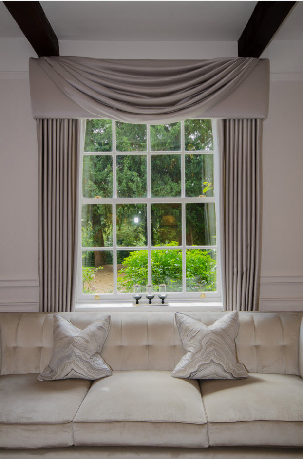- сваги – получаются в случае, если ткань перекинуть через карниз, образовывая полукруг. Чаще всего при создании роскошной шторной композиции для классического интерьера одним свагом не ограничиваются и либо создают тройную комбинацию, либо повторяют одиночный сваг на нескольких окнах гостиной или зала;