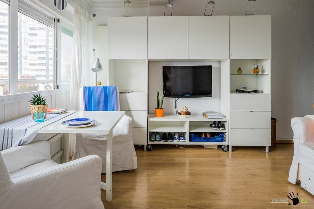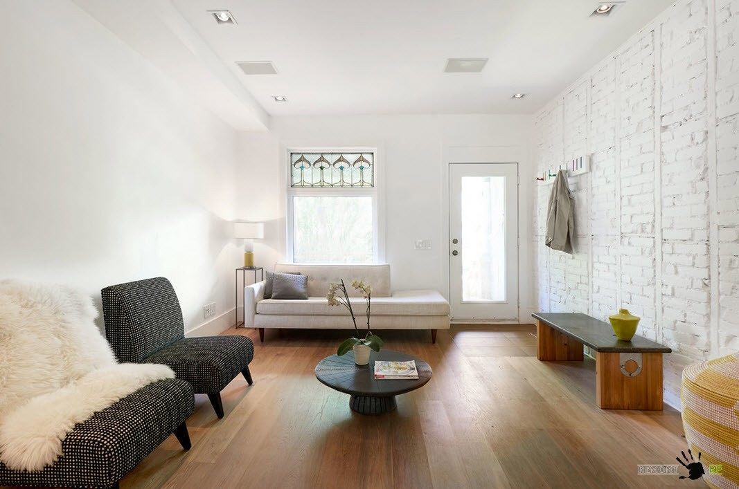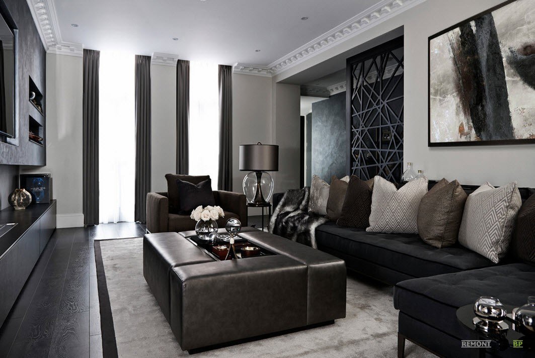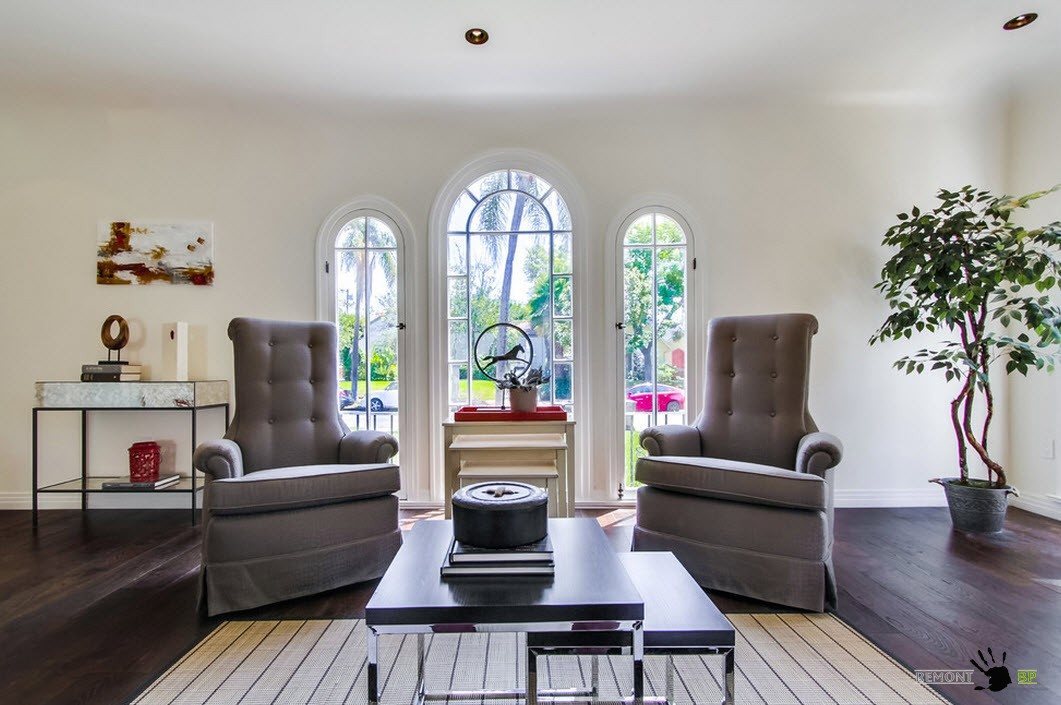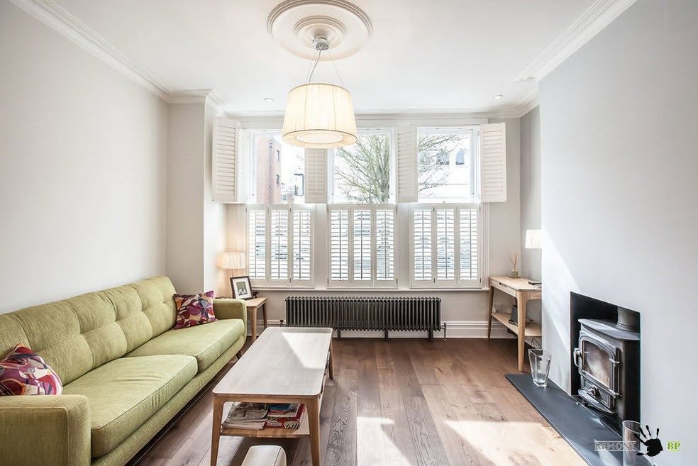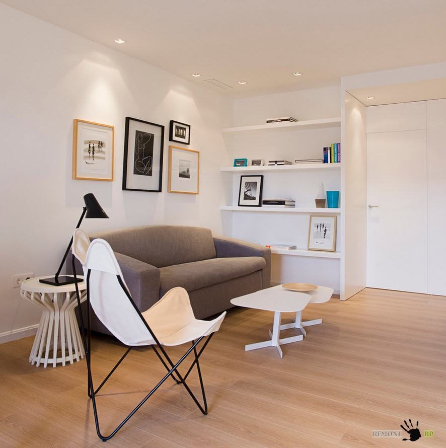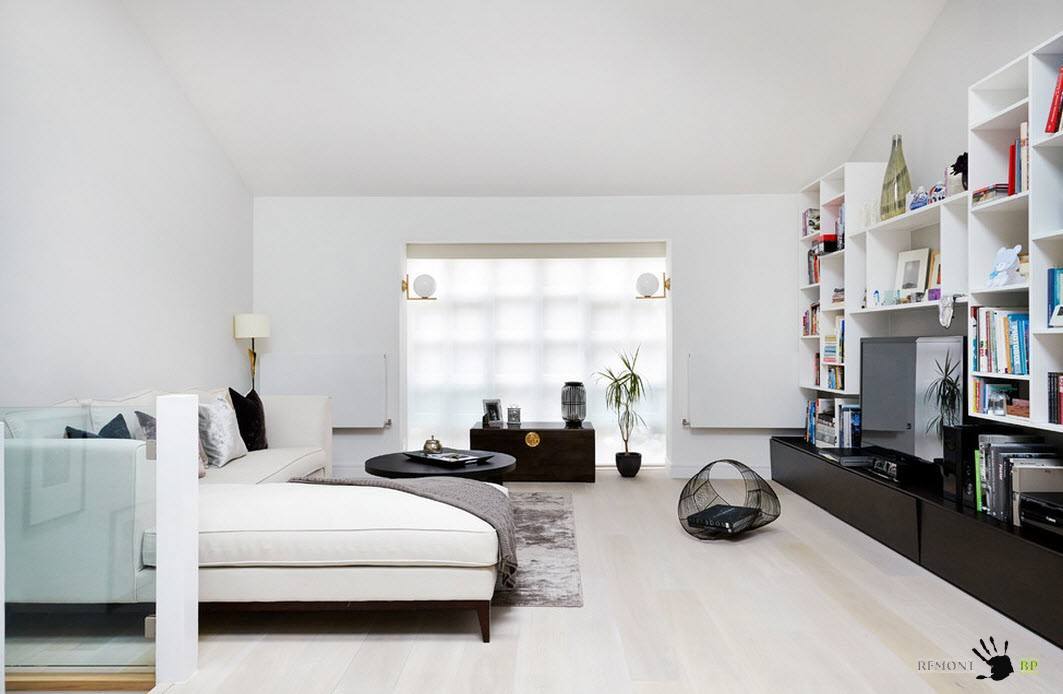 При использовании темного цвета напольного покрытия и светлого тона для отделки стен и потолка, нам удается добиться визуального расширения пространства, что очень актуально для небольших комнат в многоквартирных домах.