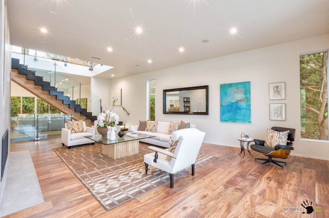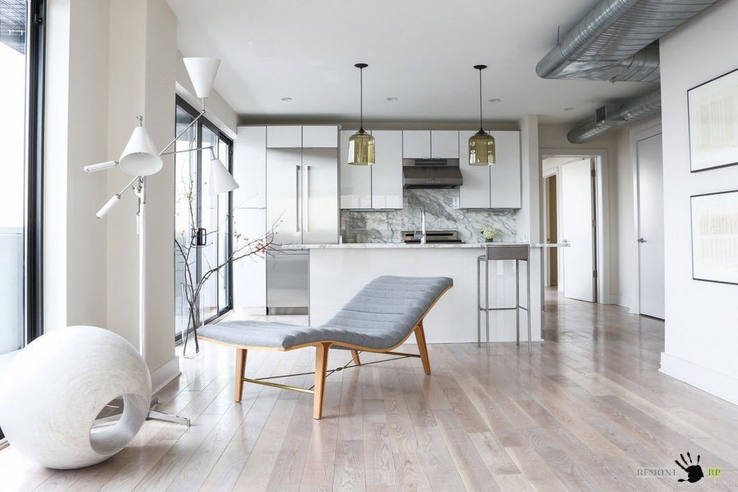 В пространствах гостиных, где в качестве цветового акцента выступает меблировка, а отделка должна лишь создавать нейтральный фон для фокусных элементов, светлый ламинат будет как нельзя кстати.