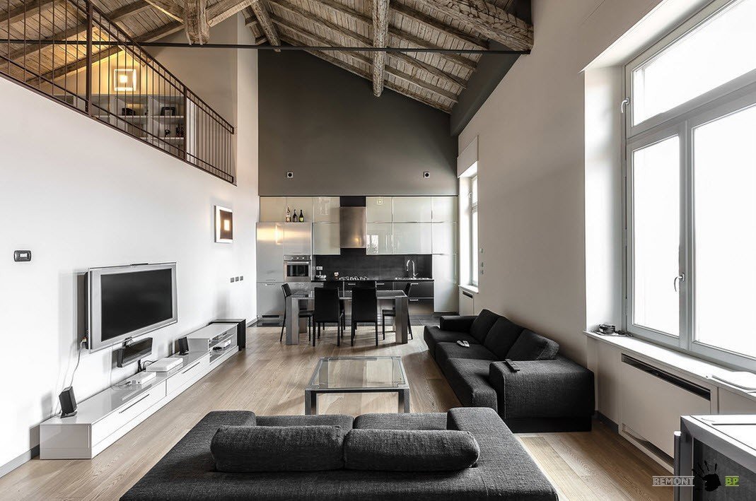 То же самое относится к использованию комбинаторики между напольным покрытием и оформлением потолка с помощью деревянных балок, перекрытий или других конструкций.