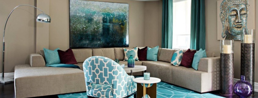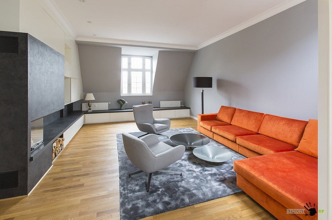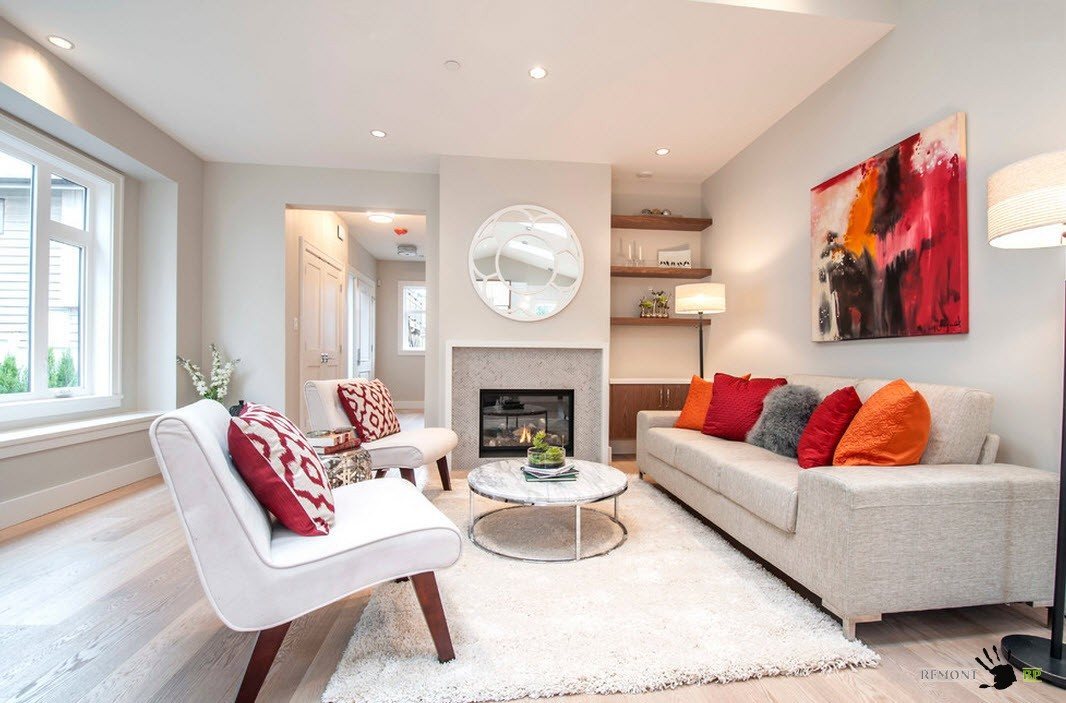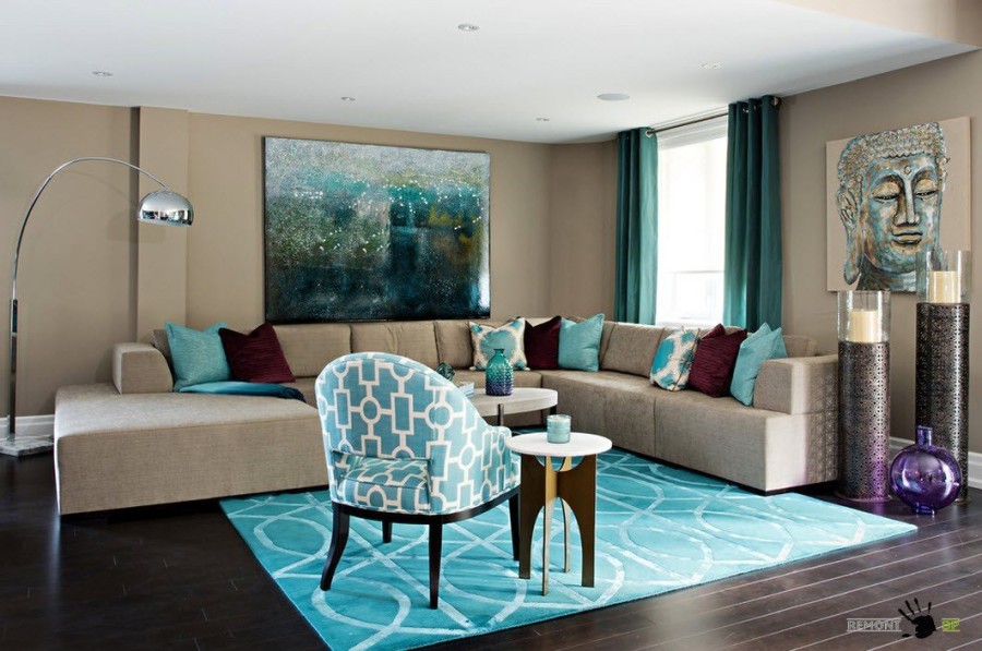 Для интерьера гостиной, выполненной преимущественно в холодной палитре цветов или с использованием нейтральных тонов, таких как все оттенки серого, напольное покрытие с ярким рисунком и теплой цветовой гаммой может стать изюминкой интерьера.