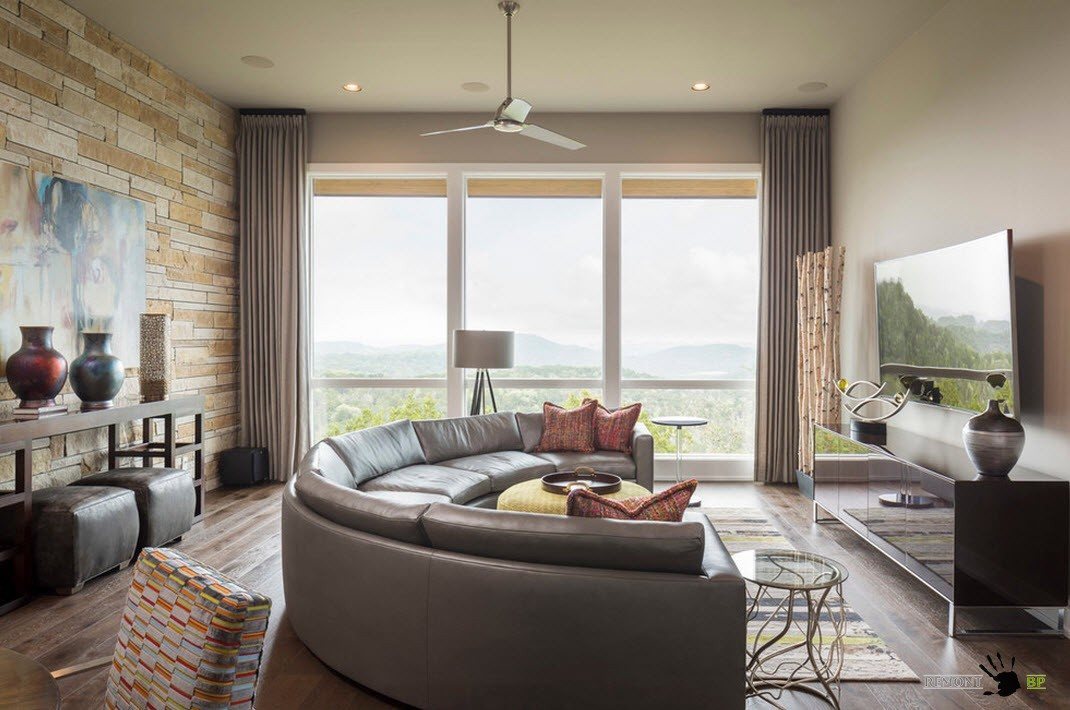 Цветовое сочетание ламината и материала, использованного для исполнения потолочных балок создает невероятно гармоничный внешний вид гостиной. Очевидно, что подобные темные и яркие цветовые и фактурные решения подойдут для комнат с большими окнами и обилием естественного освещения.