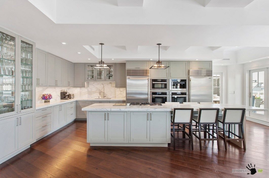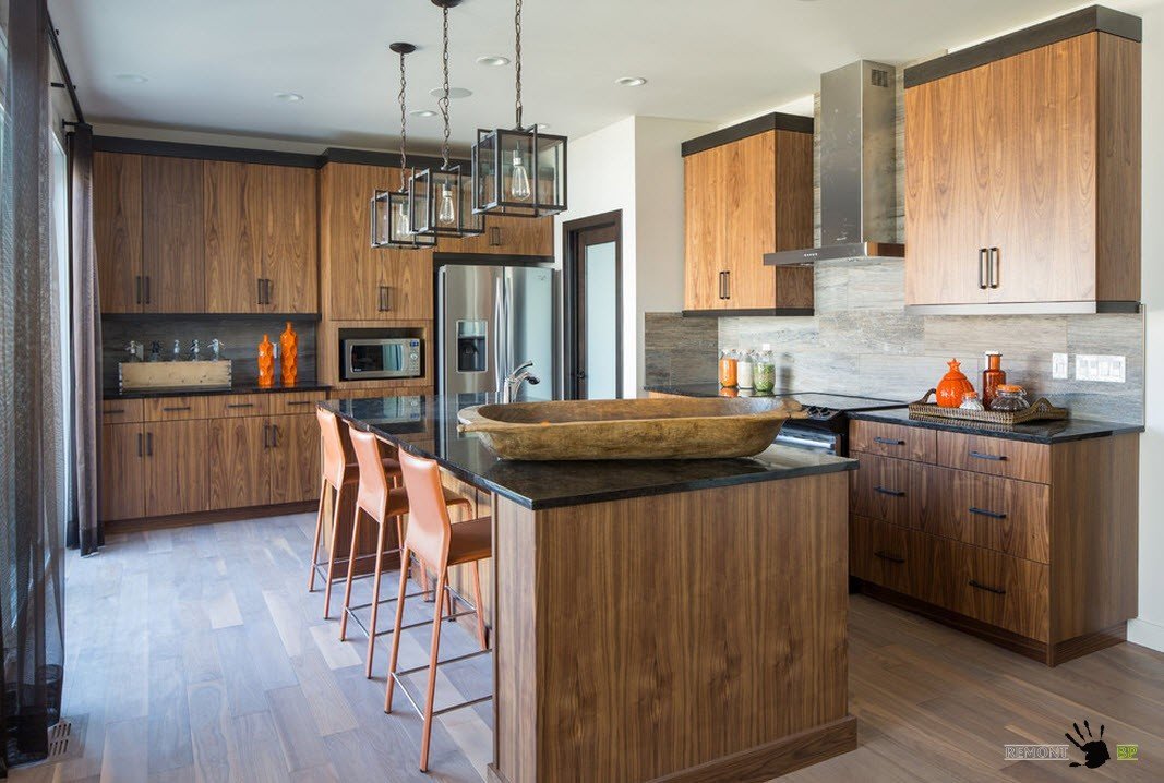 Один из вариантов облицовки полов в кухонном пространстве – сочетание керамической или каменной плитки с применением панелей ламината. В зоне рабочих поверхностей с наиболее высоким уровнем влажности и вероятностью перепадов температур укладывается плитка, остальная часть полов покрывается ламинатом. Большой ассортимент цветовых и фактурных вариантов ламинированных панелей позволит найти гармоничное сочетание с материалом из керамики, натурального или искусственного камня.