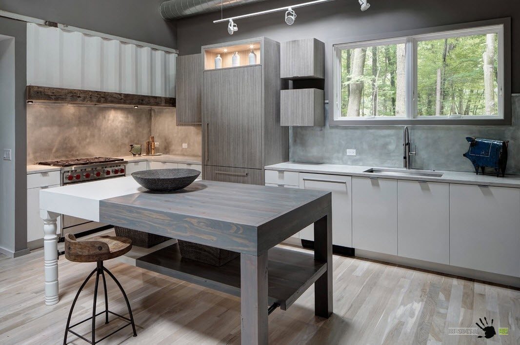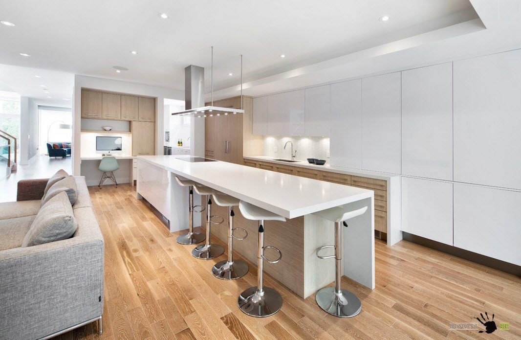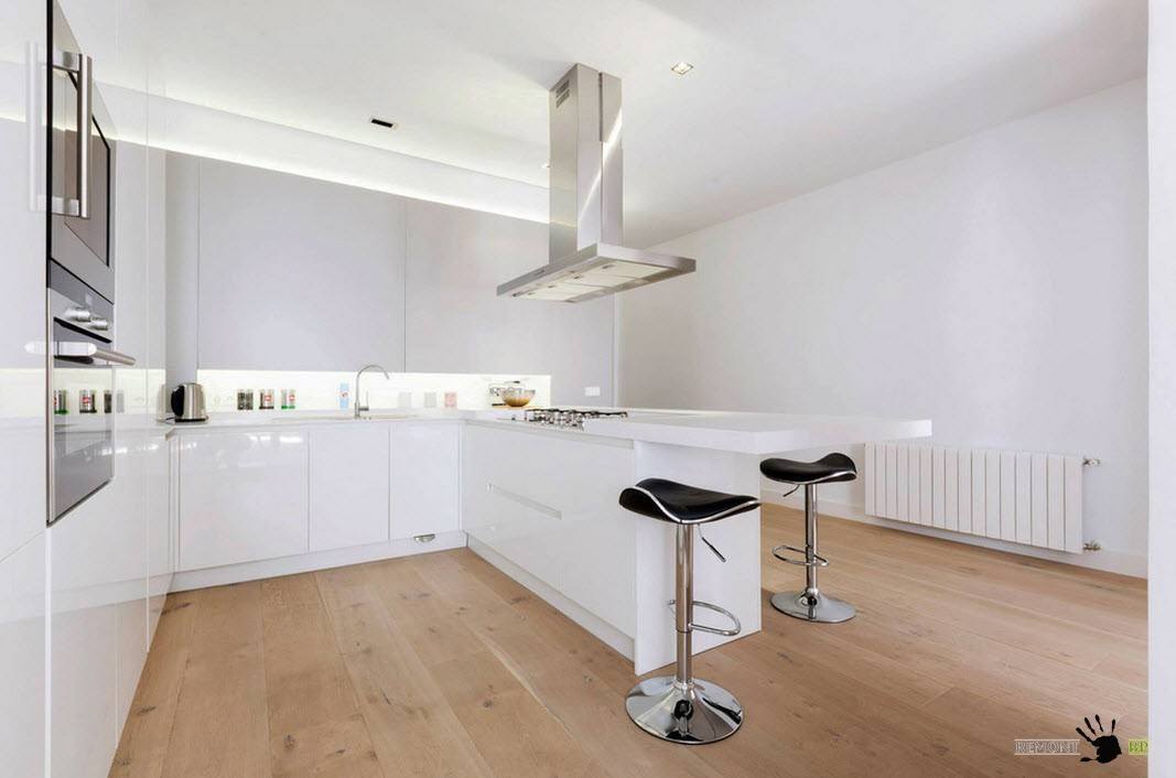 В контрастном интерьере кухни, где черно-белые сочетания используются очень активно, светлый ламинат будет наиболее актуальным. Такое покрытие не будет перетягивать на себя внимание, а станет лишь функциональным фоном для динамичного сочетания светлых и темных элементов дизайна.