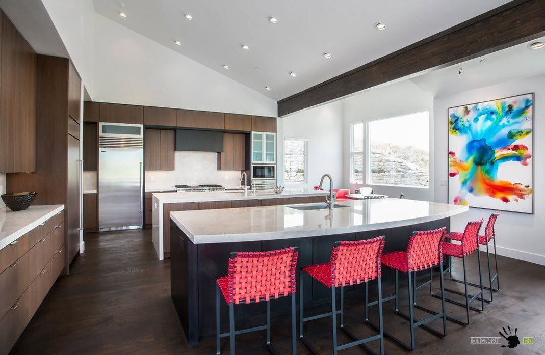 Цвет венге в напольном покрытии смотрится очень эффектно, в особенности в интерьере с контрастными цветовыми решениями. Оттенок напольного покрытия отлично сочетается с оконными рамами, потолочными балками и некоторыми предметами меблировки. Но важно понимать, что подобный окрас полов потребует от вас более тщательно и частой уборки – на темных поверхностях пыль видно очень хорошо.