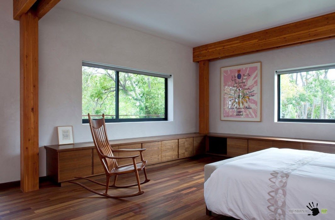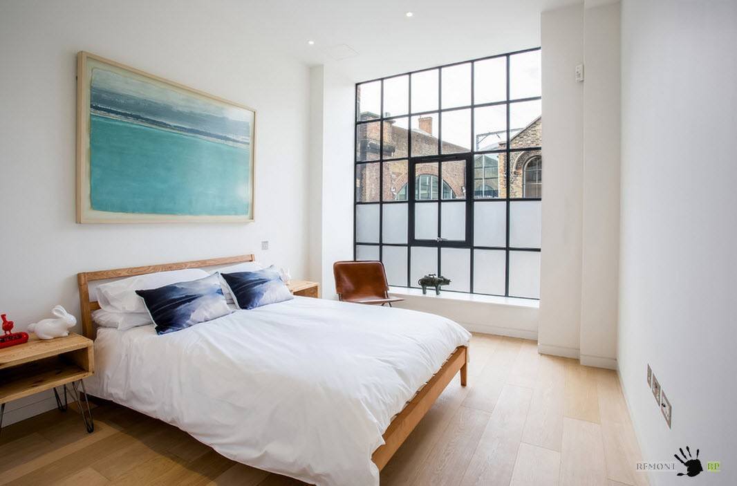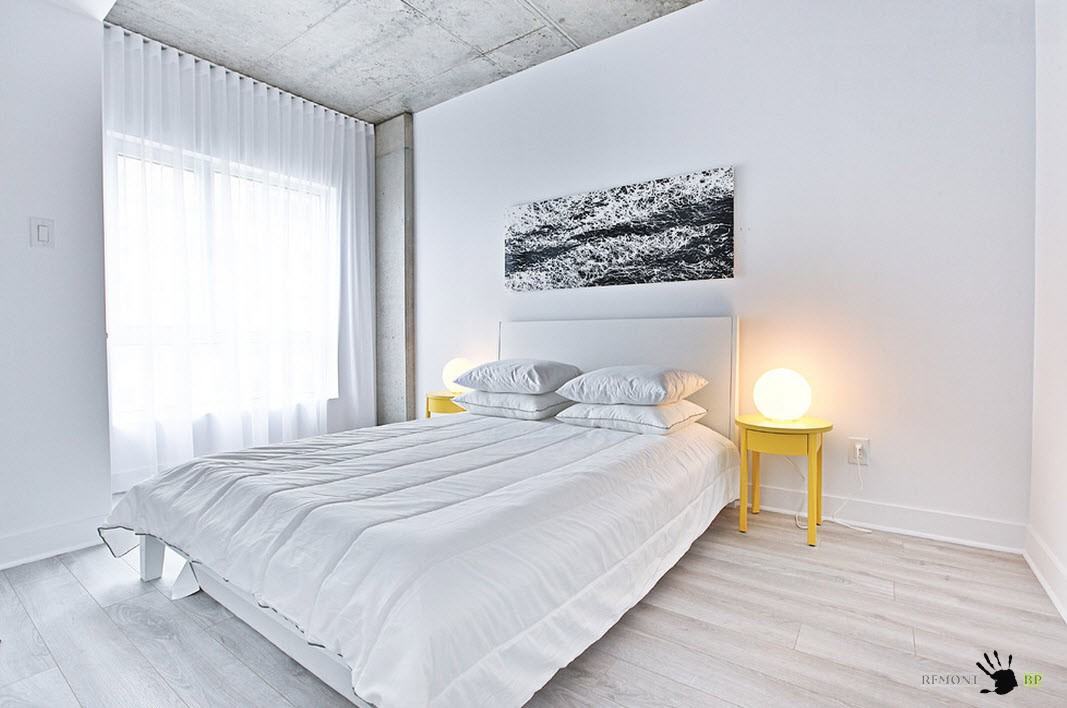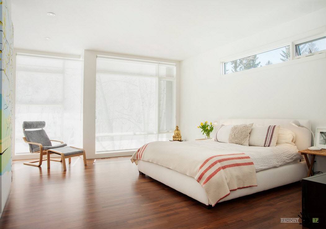 Для белоснежной спальни яркий природный оттенок напольного покрытия может стать единственным цветовым акцентом, привнесшим немного природного тепла в интерьер.