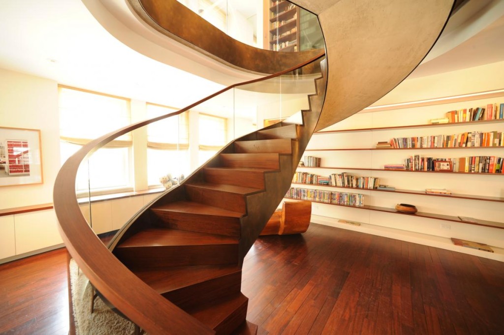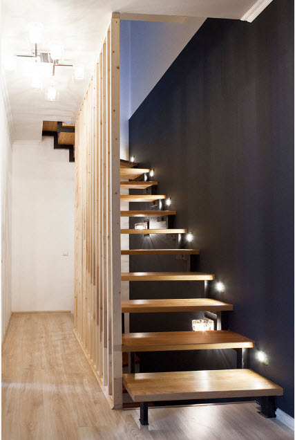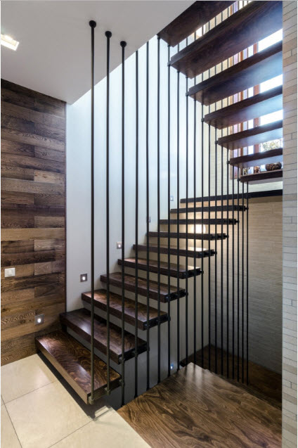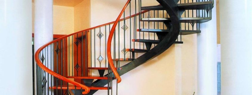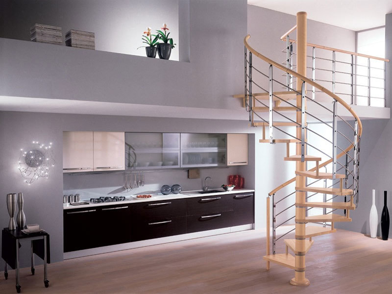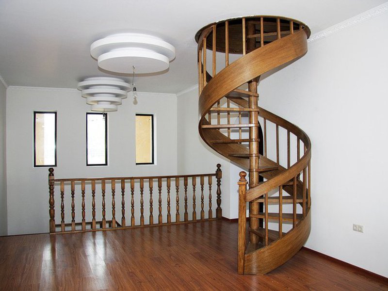 Винтовая лестница – также доступный по цене вариант, занимает минимум пространства. Особенность внешнего вида позволяет сделать любой интерьер более стильным и интересным. Состоит из центральной оси и забежных трапециевидных ступеней. Не считаются безопасными, так как можно оступиться, необходима установка качественных перил и дополнительного источника освещения.