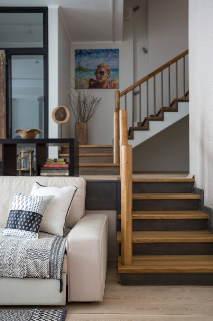 - Внутренняя – универсальный вид лестницы, располагающийся внутри дома. Удобный и практичный вариант, позволяет быстро и безопасно подниматься на мансардовый этаж в любое время года. Недостаток – может занять много места, особенно актуальна проблема в домах с небольшой площадью.