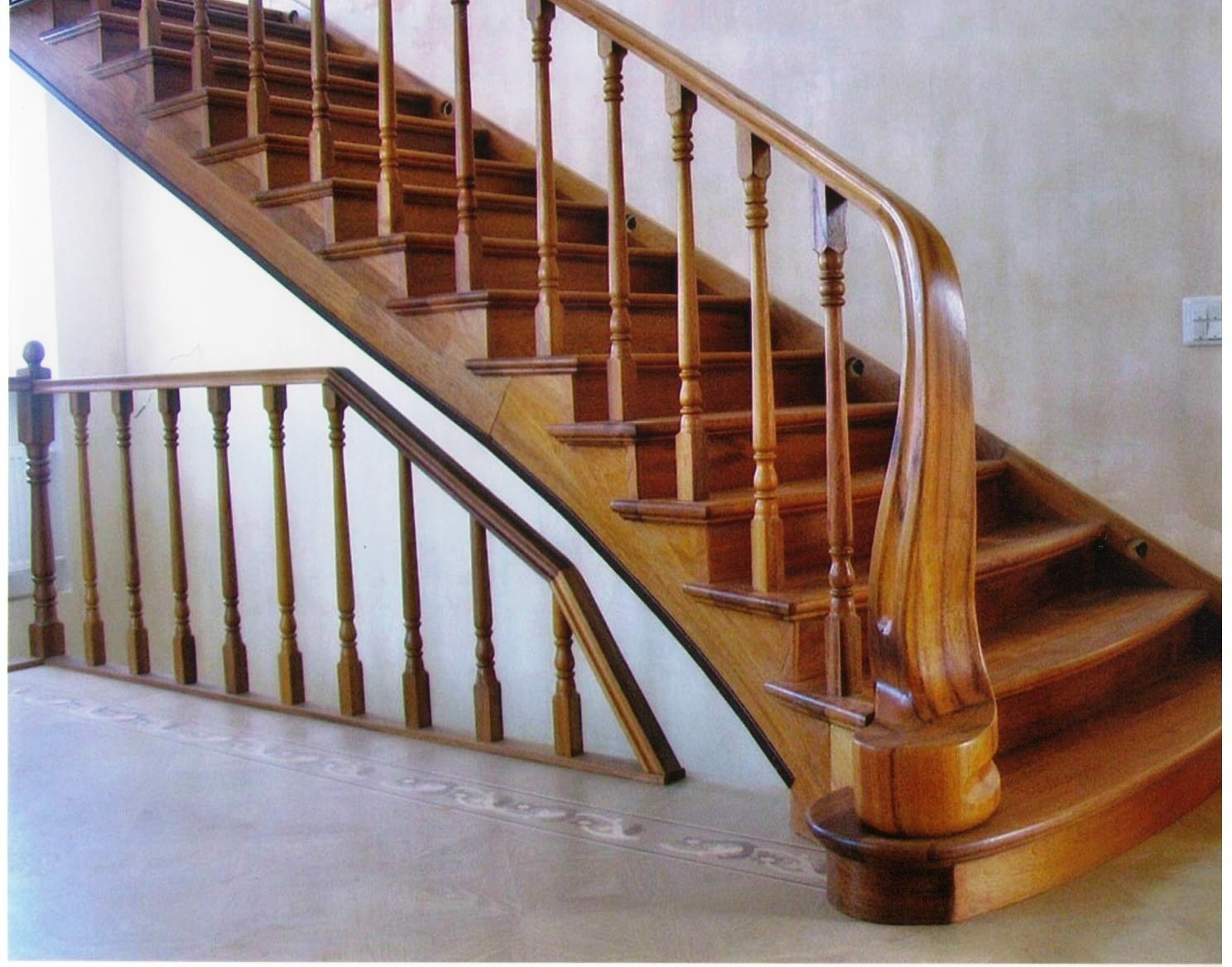 Лестница с забежными ступенями – в таком типе сооружения горизонтальная площадка отсутствует, вместо этого для поворота применяются специальные ступени трапециевидной формы. При укладке более узкая сторона кладется в сторону меньшего радиуса поворота. Средина ступени должна иметь ширину около 30-40 сантиметров. Достоинство – более успешное использование свободного пространства, габариты немного меньше, а подъем более удобный и быстрый.