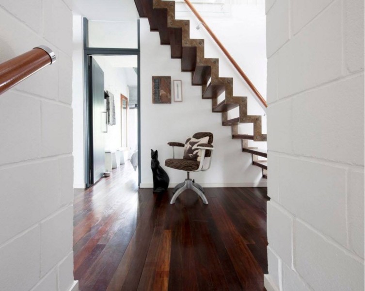 - лестница с зигзагообразным поворотом устанавливается у внутренней стены – смотрится оригинально, но и пространства требует большого.