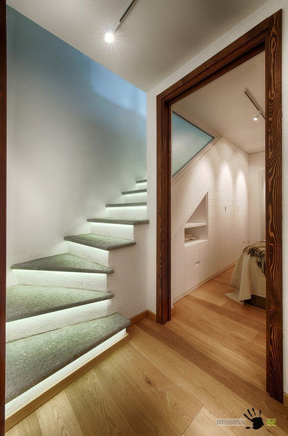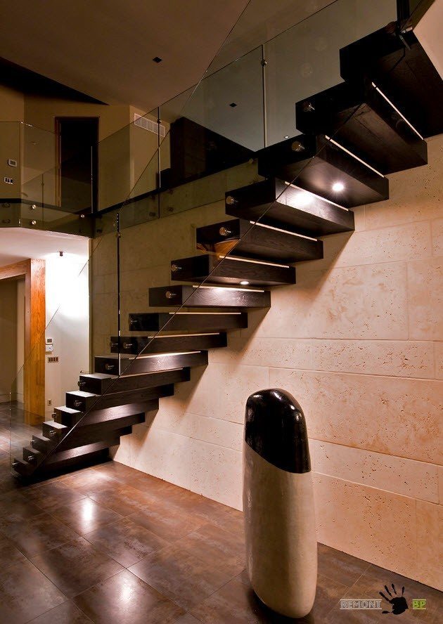 Подсвечивание ступеней или пространства возле лестницы может стать не только элементом безопасности вашего дома, но и придать оригинальности интерьеру, предоставить вам возможность создания различных вариантов атмосферы в зависимости от использования того или иного вида освещения.