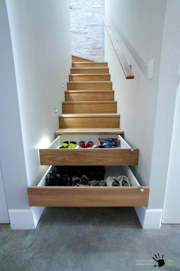 Иногда можно встретить использование пространства под ступенями в качестве систем хранения лестниц, с обеих сторон ограниченных стенами. Но при таком сооружении выдвижных ящиков важно помнить, что сильно нагружать емкости не стоит, от этого отчасти будет зависеть безопасность передвижения по лестнице.