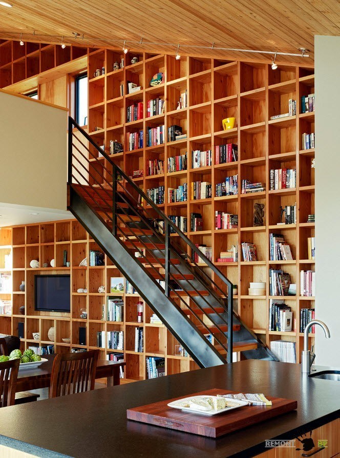 Соорудив под лестницей книжный стеллаж и поставив рядом удобное кресло и напольный торшер, вы обеспечите домочадцев возможностью в уединении почитать книгу и отдохнуть, не использовав полезное пространство комнат, которого часто просто не хватает для подобных функциональных зон.