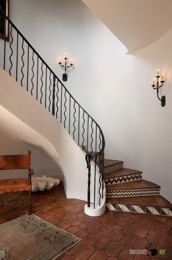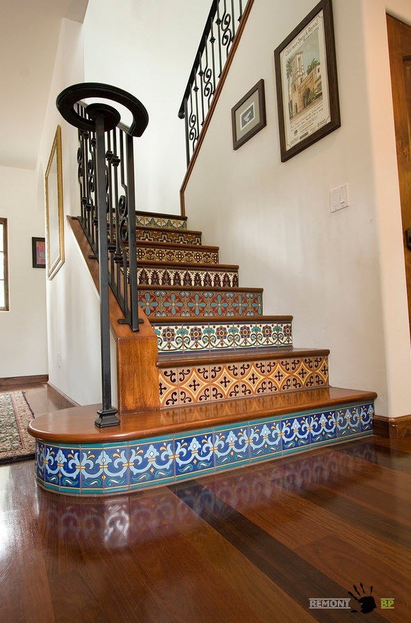 Придать уникальности можно даже самой традиционной лестницы, оформив оригинально перила или пространство под ступенями. Например, облицовка подступенек с помощью керамической плитки с ярким орнаментом позволяет привнести в интерьер помещения не только уникальности, но и позитивного настроя, праздничного внешнего вида.