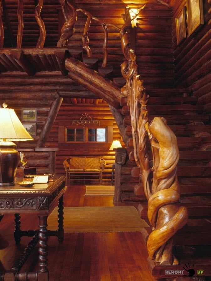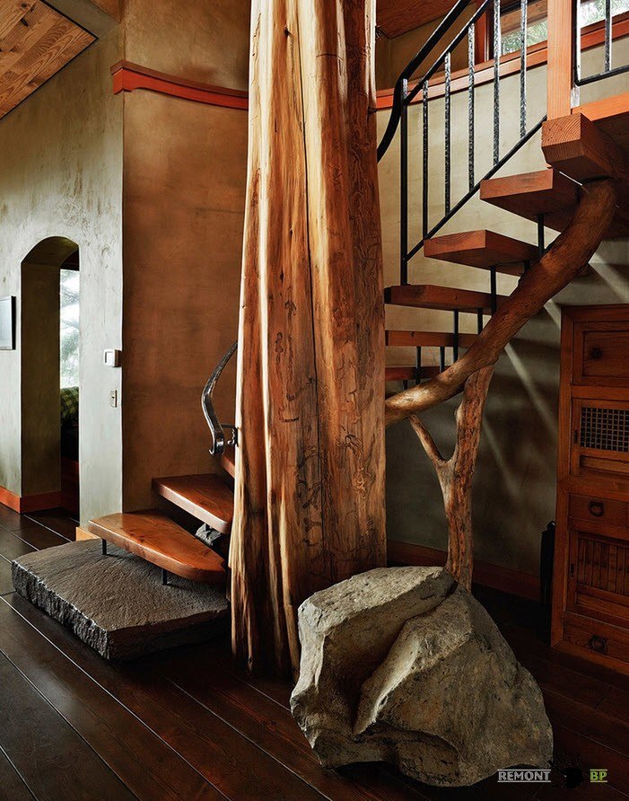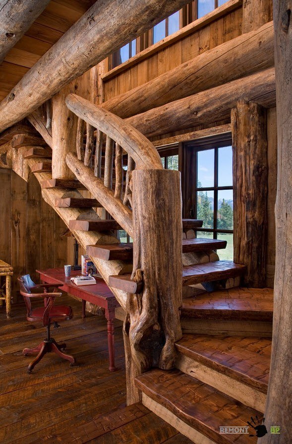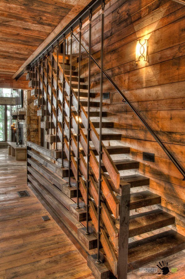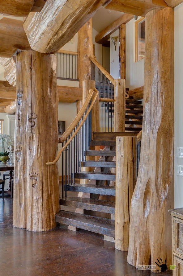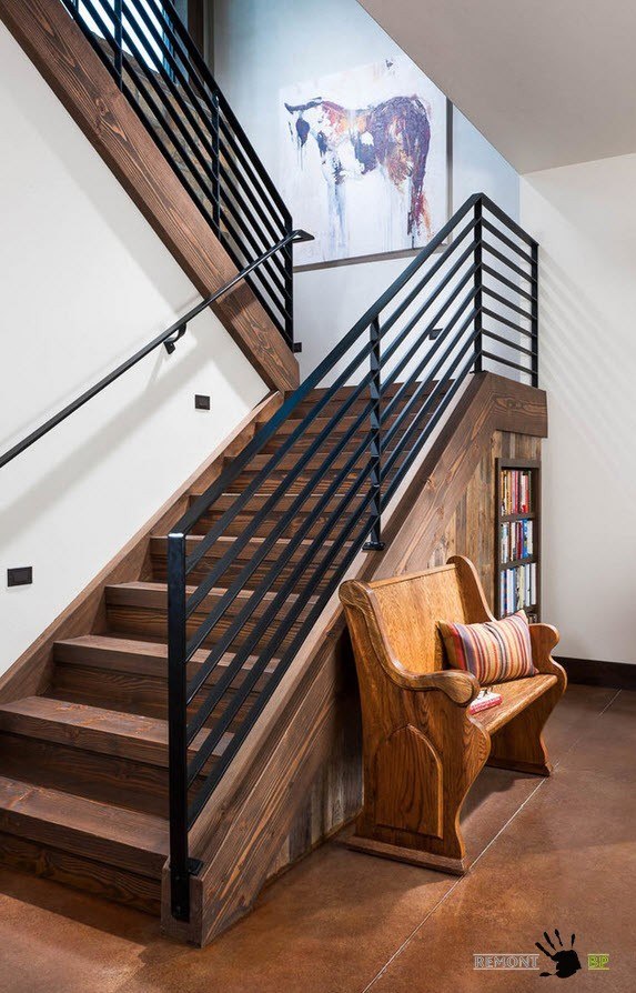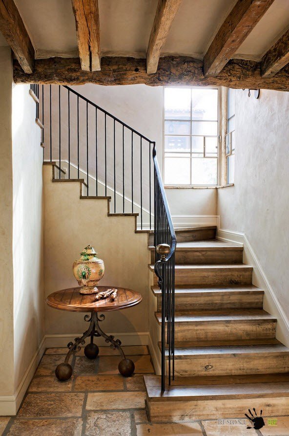 В помещениях, оформленных в стиле кантри часто можно встретить рустикальные элементы в конструкции лестниц. Как правило, рустикальность затрагивает элементы перил, иногда опор.