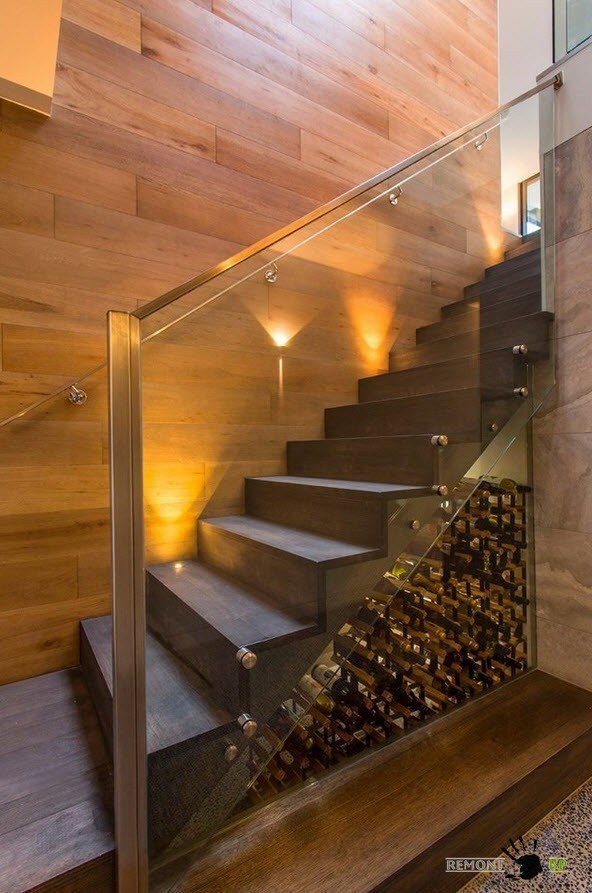 Некоторые домовладельцы предпочитают оборудовать пространство под лестницей под винный шкаф. Помимо функциональной подоплеки, смотрятся такие системы хранения эффектно и современно, становясь изюминкой интерьера.