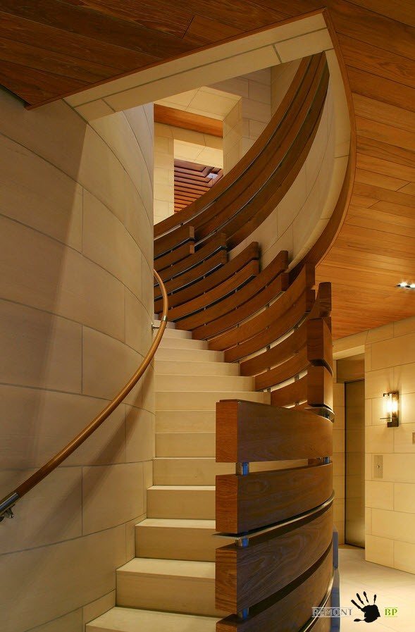 Лестница с изогнутым основанием, которая не является винтовой, но при этом имеет плавные формы, выглядит более чем эффектно. Ступени крепятся к центру основания, имеющего изогнутую форму. Безусловно, при такой конструкции лестницы обойтись без перил будет сложно. Подобное сооружение не занимает много места и не требует массивного основания – опоры.