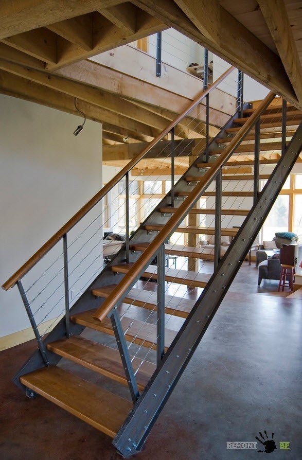 Сочетание металла и дерева предоставляет множество вариаций для дизайна прочной и надежной лестницы, которая органично впишется в современный стиль интерьера, стилистику лофт или кантри.