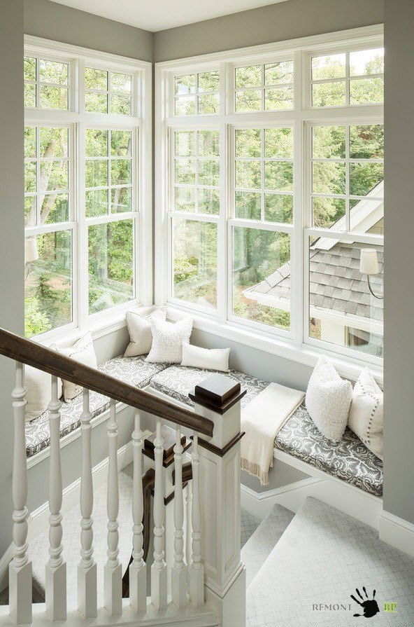 В некоторых домах (в зависимости от архитектурных особенностей помещений) получается рационально использовать не только пространство под лестницей, но и территорию лестничных площадок между маршами. Мягкие места для сидения у окна помогут организовать зону для чтения или бесед.