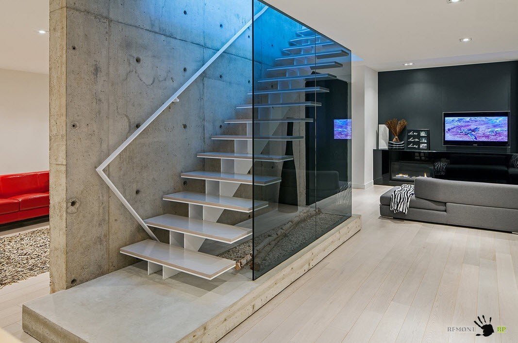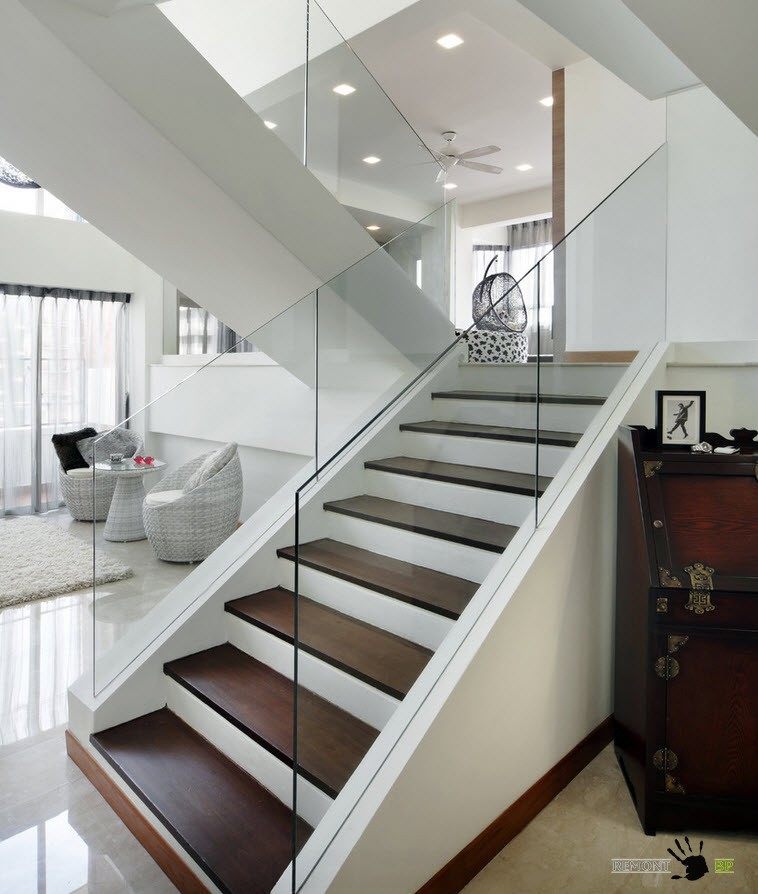 Использование стеклянных или пластиковых прозрачных перил в виде экранов позволяет создать более легкий образ лестницы для современного интерьера. Единственный недостаток – отсутствие перил в идее, к которому мы привыкли, невозможность опираться на крепления. Но при таких коротких маршах этот недостаток несущественен, если только в доме нет пожилых людей с проблемами передвижения.