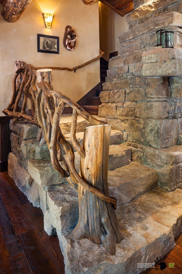 Лестница, ступени которой составлены из необработанного камня, выглядит внушительно, прочно и безопасно. Рустикальности такому сооружению добавляют оригинальные перила, выполненные из гибких ветвей, которые на первый взгляд не прошли никакой обработки.
