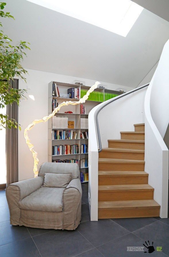 Благодаря тому, что подобные лестницы не имеют основания, пространство под ними можно использовать на пользу домочадцам, обустроив место для отдыха, уголок для чтения с небольшой библиотекой.