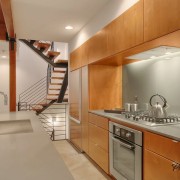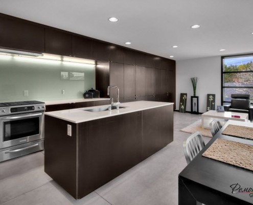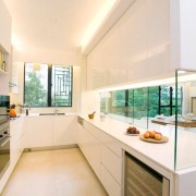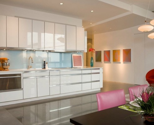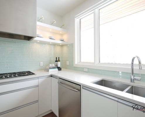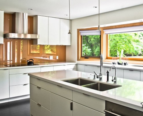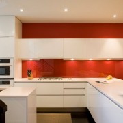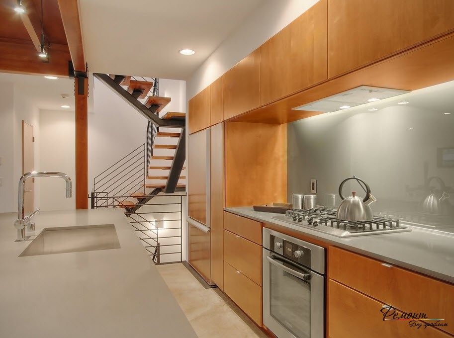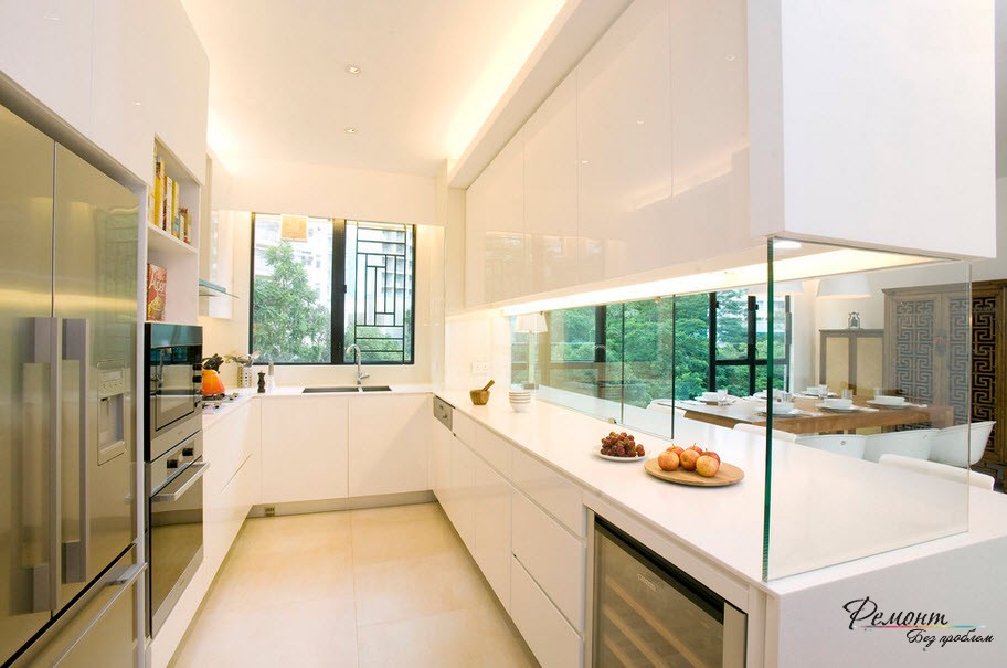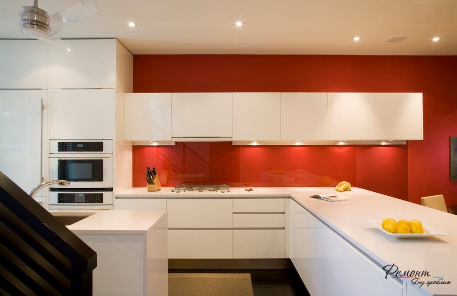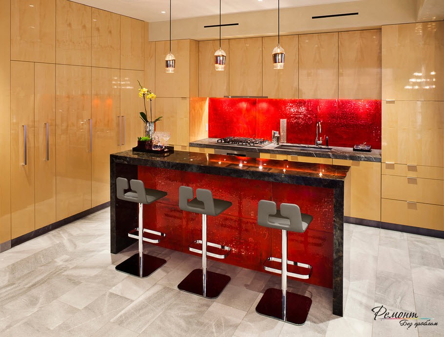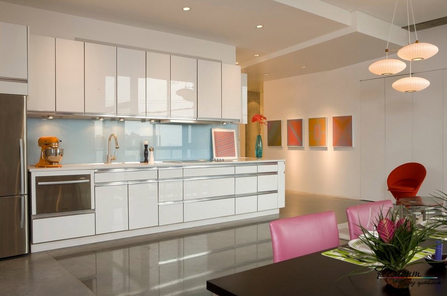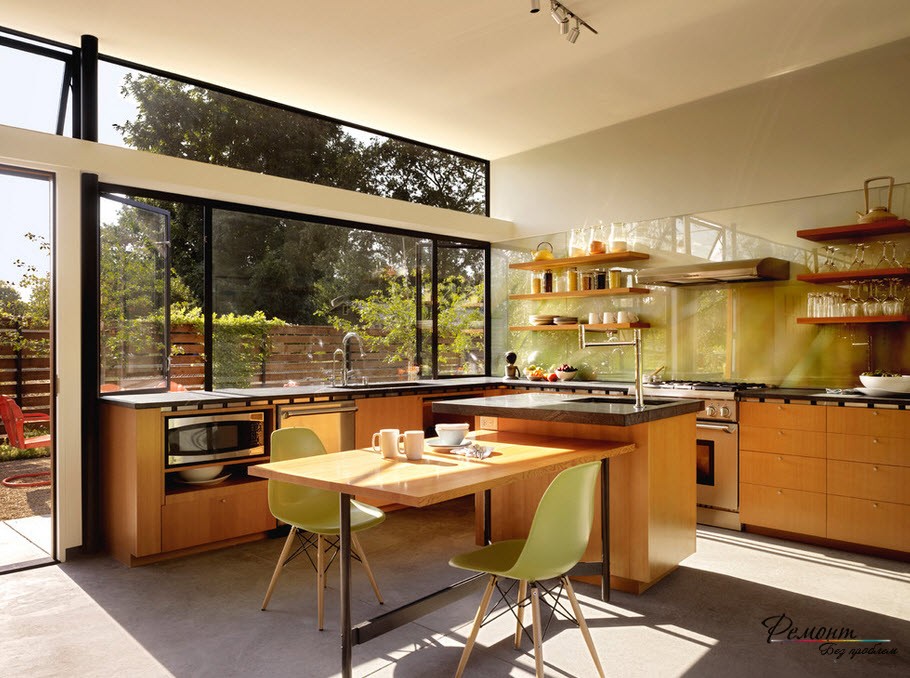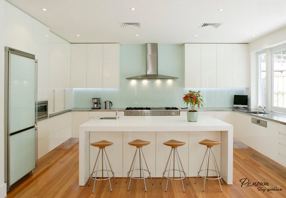 Недостатком такого оформления может быть высокая стоимость, но это компенсируется долгим сроком службы. За время эксплуатации стеклянной поверхности на другой кухне придется сменить не один фартук из плитки или пластика.