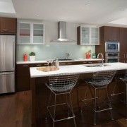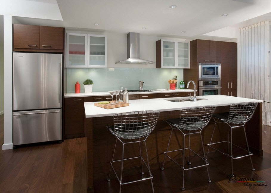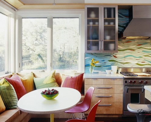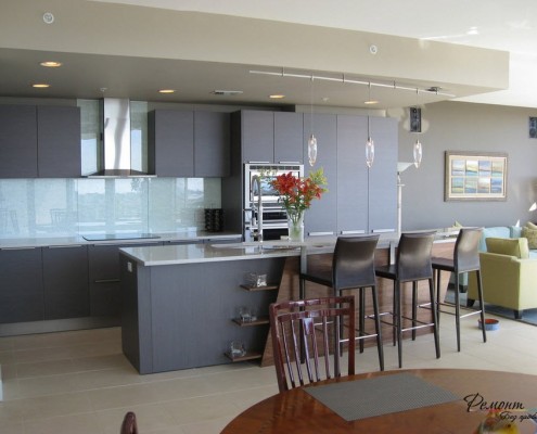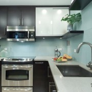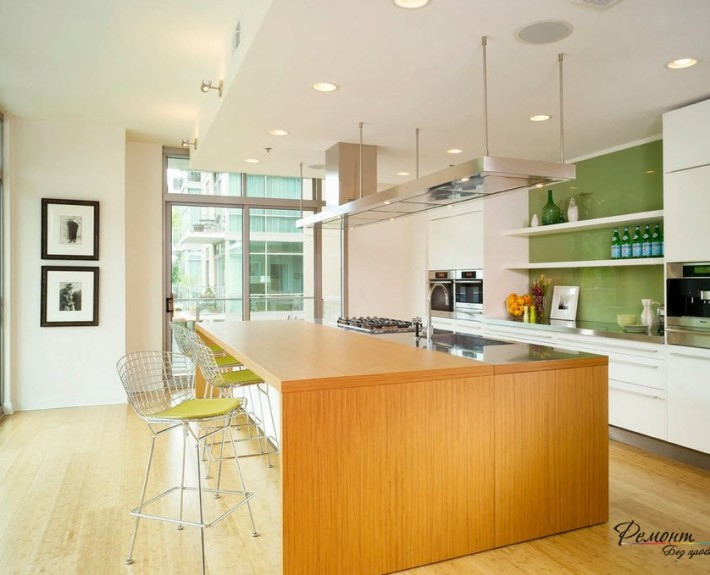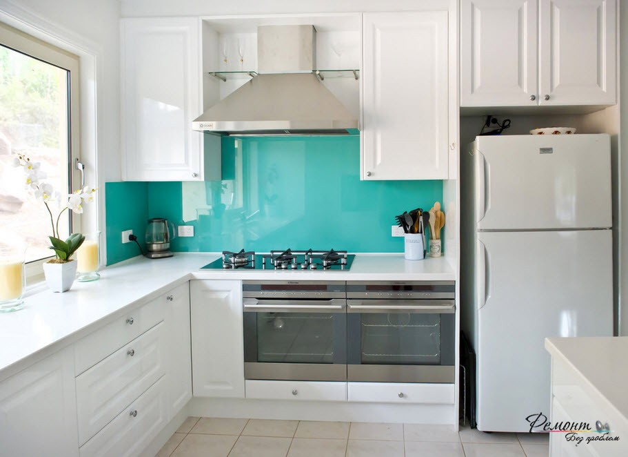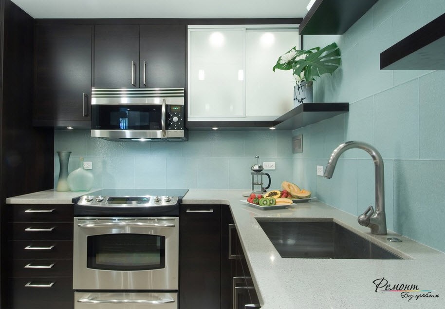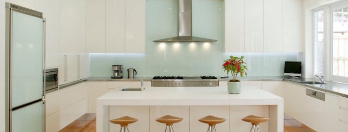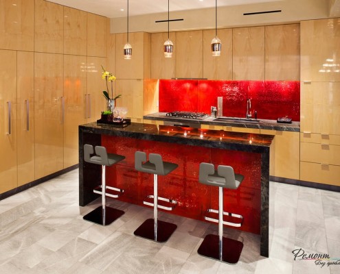 Одна из возможностей внести в интерьер кухни стильную деталь – это установка над рабочей поверхностью фартука, сделанного из стекла. Такой элемент, подобранный со вкусом, будет приковывать к себе взгляды посетителей, осуществляя при этом свою основную защитную функцию.