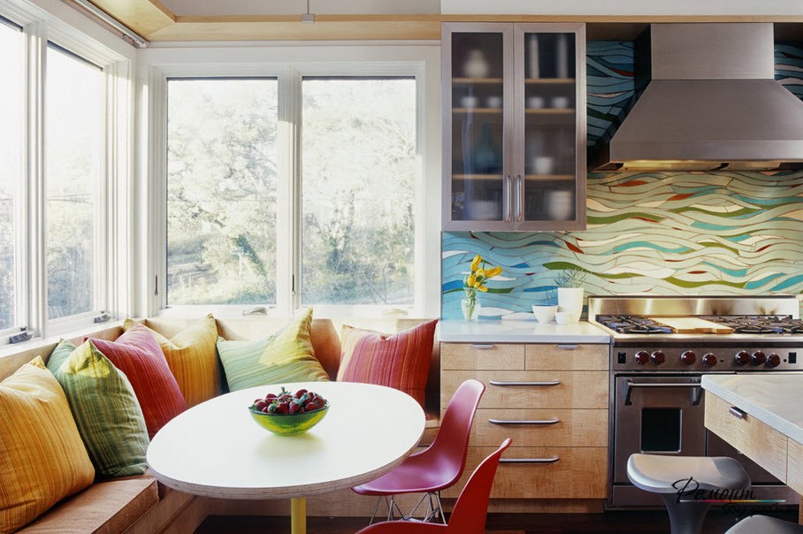 Скинали может быть сделано не только из стекла, но для кухонного фартука этот материал будет особенно выразительным. Среди разновидностей такого изделия стоит выделить: