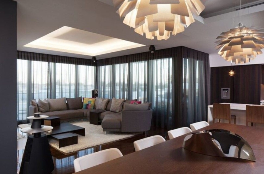 Расположение люстры над обеденным столом, если речь идёт о гостиной, выполняющей одновременно функции столовой, позволит акцентировать внимание на обеденной зоне. В этом примере в других частях комнаты следует дополнительно установить напольные абажуры или настенные бра.