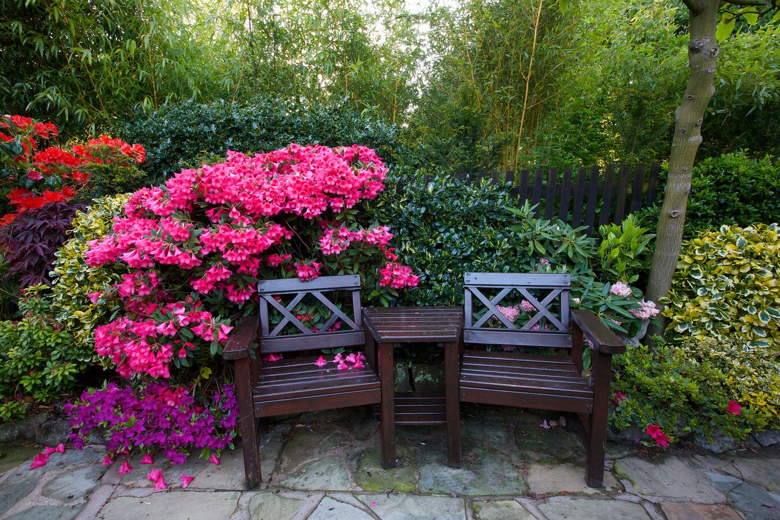 Хорошим примером вечнозеленых растений являются такие растения, как рододендроны. Широколиственные вечнозеленые растения сохраняют свою зелено-бронзовую аккуратную листву даже в течение зимы. Считаются более крупными кустарниками, чем, например, азалии. У рододендронов более выраженные и крупные листья.