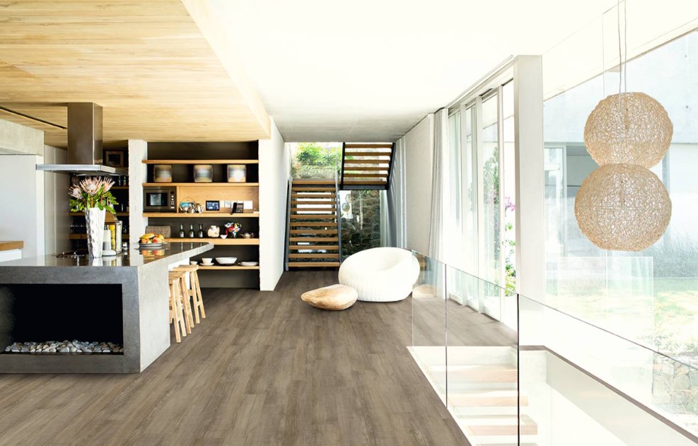 Данный вид покрытия для пола относится к категории модульных напольных покрытий. Производят кварцвиниловую плитку из поливинилхлорида и кварцевого песка, придающего повышенную прочность плитке. В списке положительных качеств данного вида покрытия для пола простота и скорость монтажных работ, влаго- и износостойкость, прочность и долговечность. Также плитка из кварцвинила отличается роскошным ассортиментом фактур и расцветок, антистатическими качествами и легко ремонтируется в случае механических повреждений. Обязательно учесть следующие нюансы: тяжелая мебель может оставлять вмятины на полу, а перед укладкой необходимо выравнивание пола.