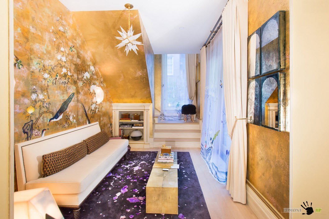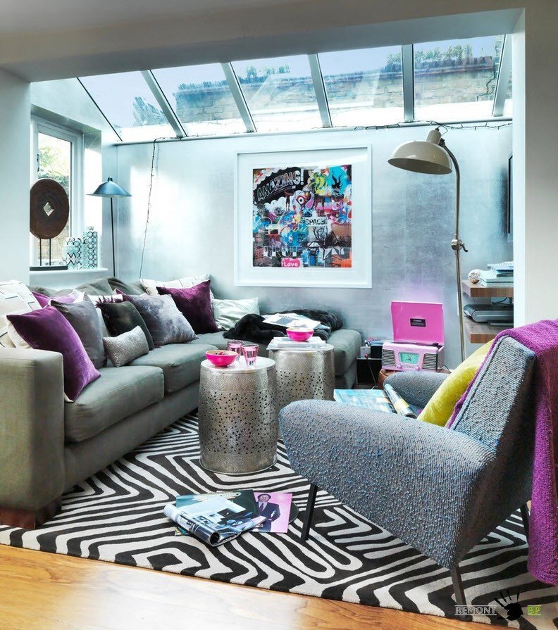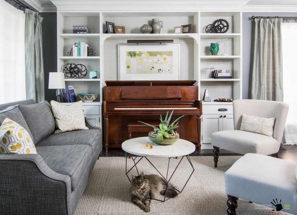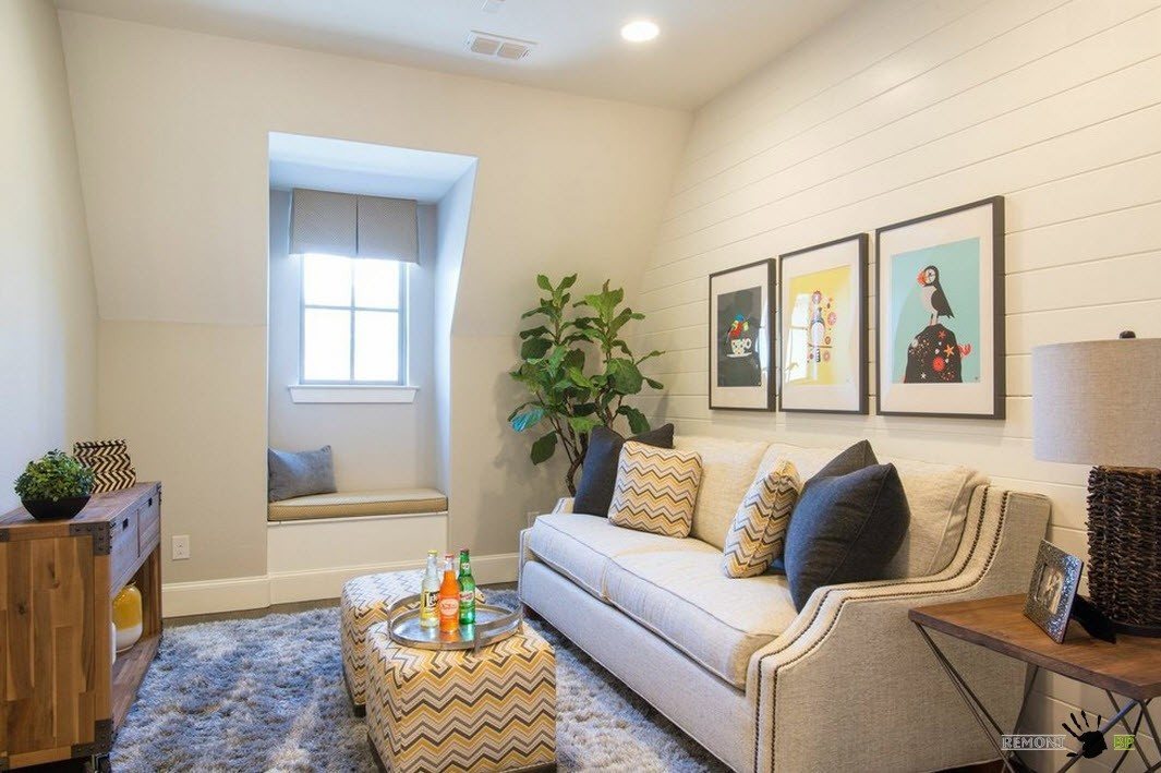 Используйте асимметрию и неправильные формы комнаты себе на пользу насколько это возможно. Если гостиная располагается в мансардном помещении с потолками, имеющими большой скос, то старайтесь располагать с местах наименьшей высоты потолков места для сидения, невысокие системы хранения. Если комната ввиду оригинальной планировки имеет ниши и закутки – в них всегда можно встроить системы хранения или оборудовать мягкие места для сидения. В таком случае, достаточно повесить рядом настенный светильник и место для чтения готово.