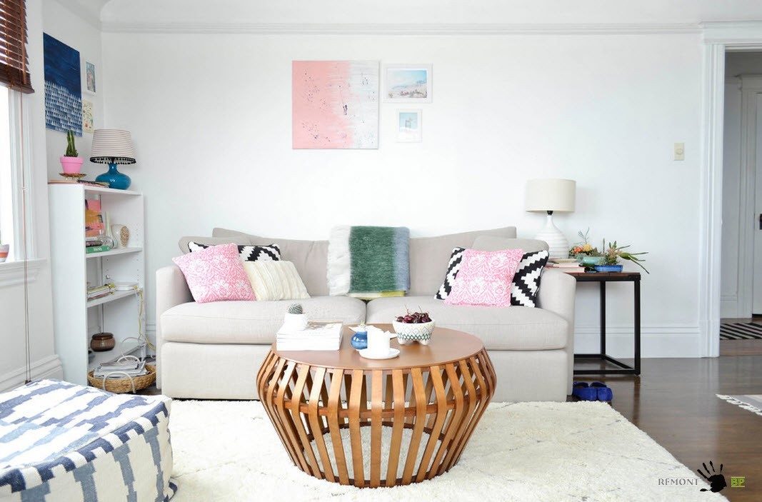 Мы все прекрасно понимаем, что светлая цветовая гамма помещения визуально его расширяет, создает иллюзию того, что пространство больше, чем есть на самом деле. Многие стилистические направления для оформления интерьеров тех или иных помещений основываются на белоснежной отделке стен и обустройстве комнат с помощью меблировки природных оттенков с применением ярких аксессуаров в качестве акцентов. И такие дизайнерские приемы пользуются большой популярностью, потому что являются наиболее простым и понятным для домовладельцев вариантом обустройства небольшого помещения. Белый цвет отделки гостиной позволяет чувствовать определенную свободу при выборе остальных предметов интерьера – мебели, декора, осветительных приборов, текстиля. На белом фоне отлично смотрится любой цвет, даже нейтральные оттенки приобретают особый шарм и вам не нужно беспокоиться о комбинаторике.