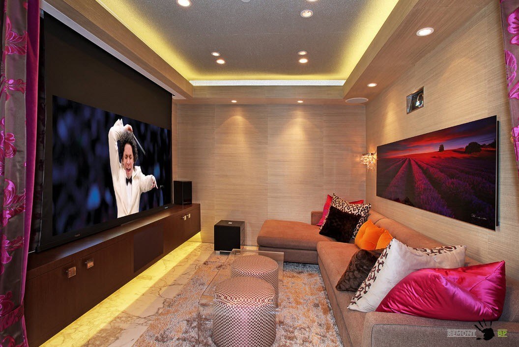 Встроенная система подсветки способна размыть границы вашей небольшой комнаты для отдыха всей семьи. И речь идет не только о знакомой многим подсветки, скрывающейся в недрах подвесных потолков, но и светодиодных лентах. Преображающих вид корпусной мебели, конструктивных элементов помещения или предметов декора.