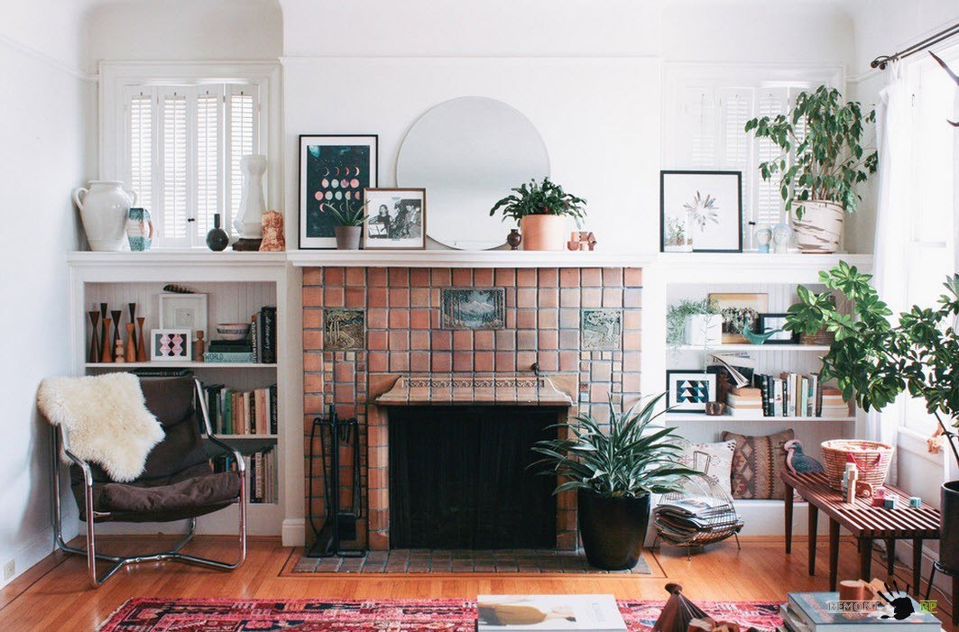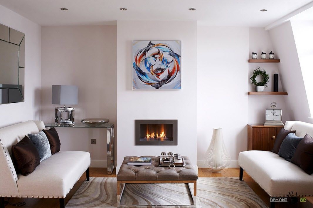 Для обустройства камина необходимо выделить не так уж много места, к тому же, пространство над ним можно использовать под организацию TV-зоны или повесить большое зеркало в красивой раме, которое помимо основного предназначения, будет визуально увеличивать масштабы вашей гостиной.