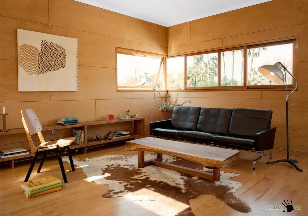 Использование теплых природных оттенков способствует созданию приятной, уютной атмосферы в помещении гостиной. Особенно это касается отделки комнаты, в которой используются натуральные материалы, например, деревянные настенные панели. Подобное оформление позволяет создать атмосферу близости к природе, как в жилищах, находящихся за чертой города, так и в рамках городских квартир.