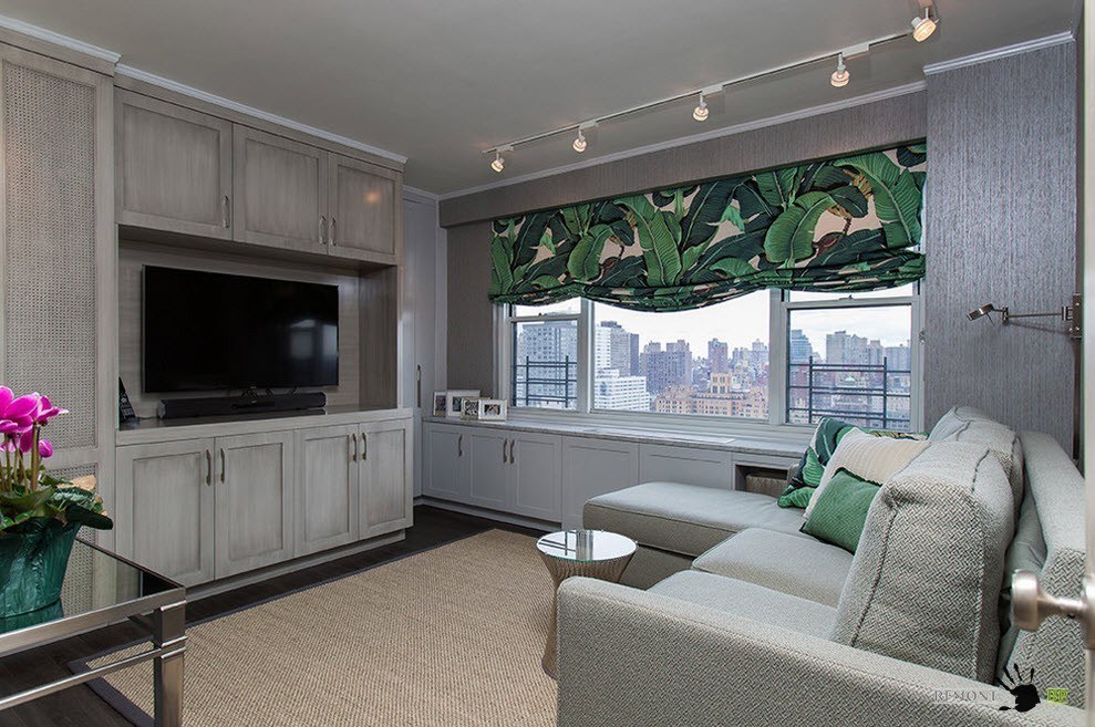 Встроенная мебель, а именно, системы хранения помогут сэкономить полезное пространство небольшой гостиной. О расположении больших встроенных шкафов говорить не приходится, но компактные распашные или выдвижные ящики, стеллажи и полки способна вместить даже маленькая гостиная. Например, стена, с окном не может быть использования для установки крупной мебели возле нее пространство, но пространство вокруг окна (в особенности под ним) можно отдать под встроенные системы хранения.