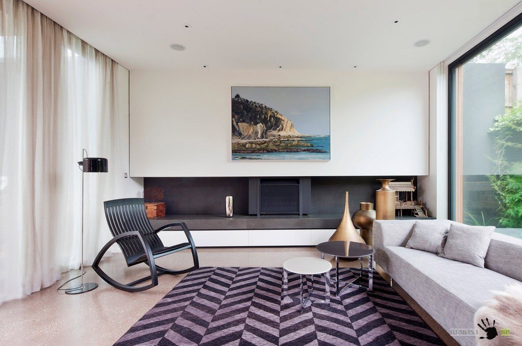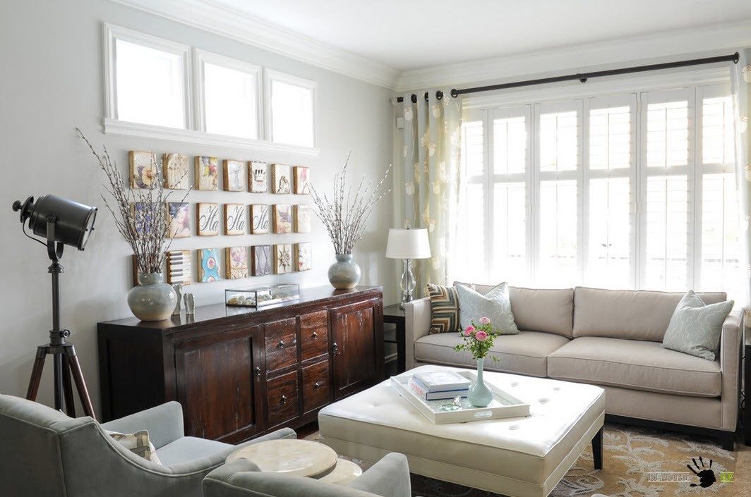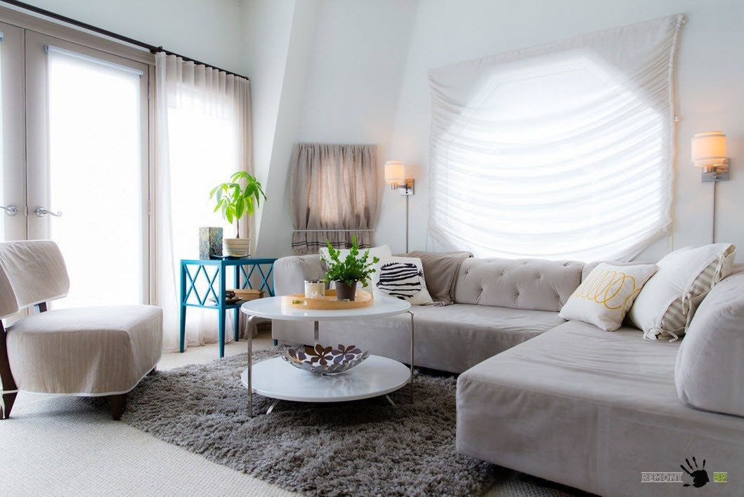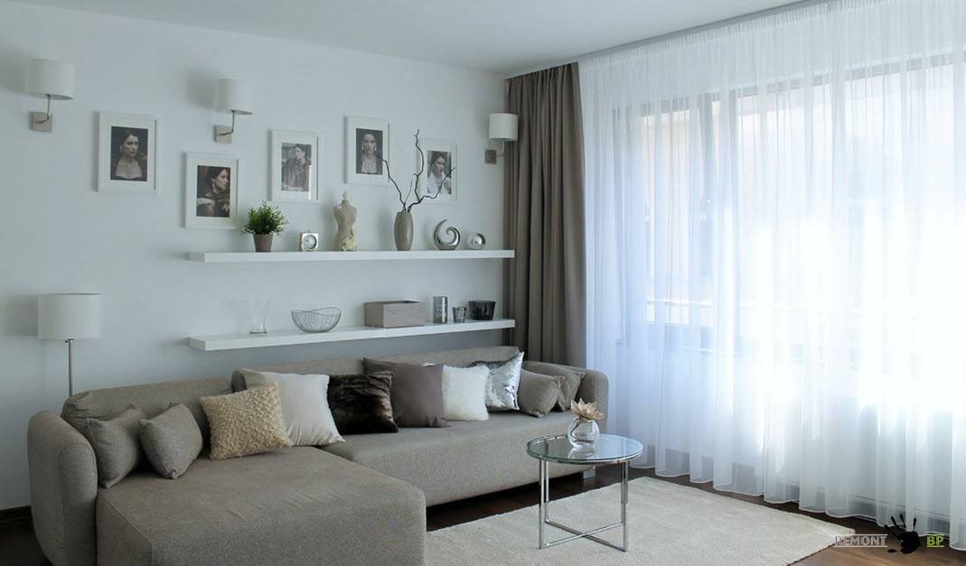 Белоснежные стены, на фоне которых располагается мебель в нейтральных оттенках в сумме могут давать весьма скучный образ гостиной. Создать акценты в отделке можно с помощью использования для оформления одной из стен помещения интересные обои с фотопечатью или фактурную отделку того же цвета. Подобный подход не нарушит общей цветовой гаммы помещения, но интересный и уникальный элемент дизайн в интерьер гостиной внесет.