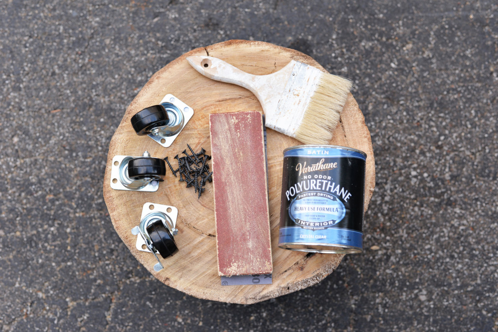 Небольшой пенек, 3 или 4 поворотных колеса для изготовления ножек, дрель, винты, наждачная бумага или шлифовальная машинка, кисти, полиуретановый лак.