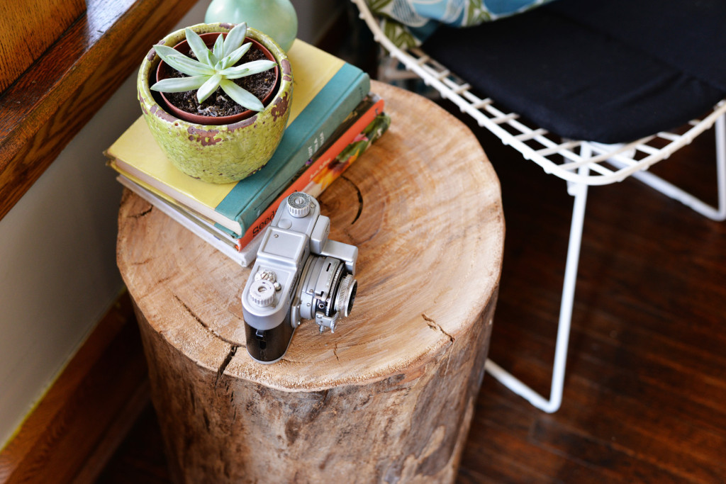 Можно ставить столик рядом с креслом, диваном или кроватью. Натуральный узор в виде колец на верхней части смотрится очень эффектно. Несмотря на то, что столик из цельного дерева получается тяжелый, его легко перемещать за счет ножек с колесами.