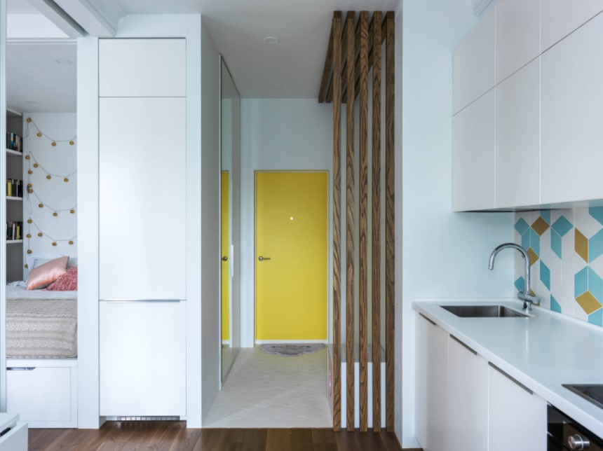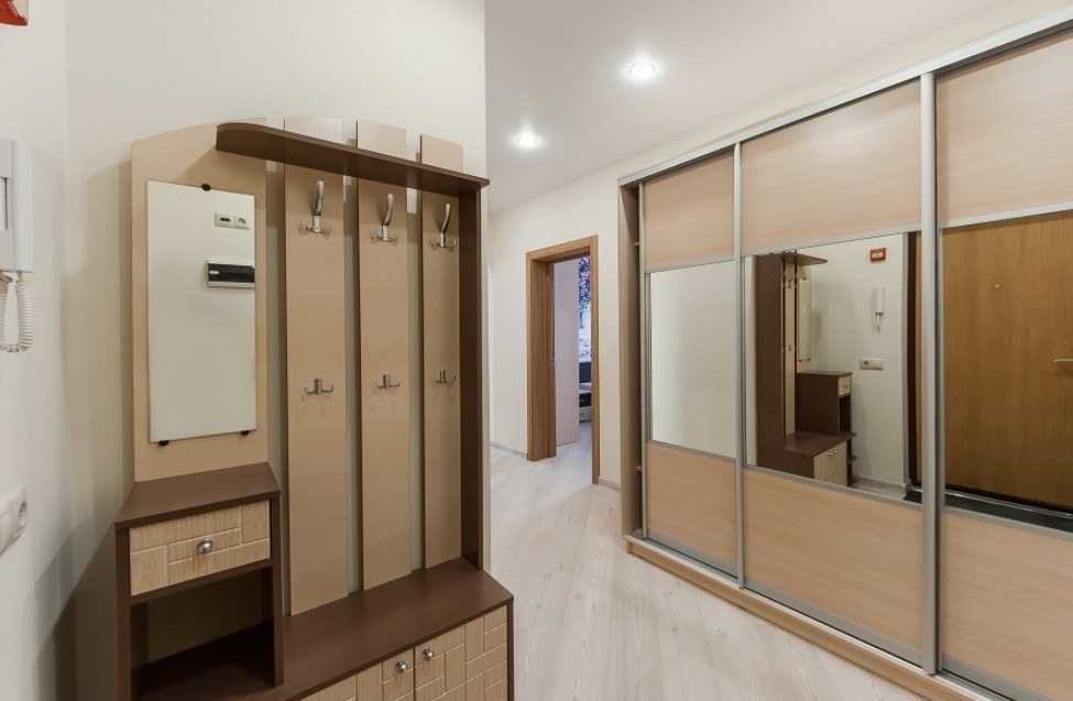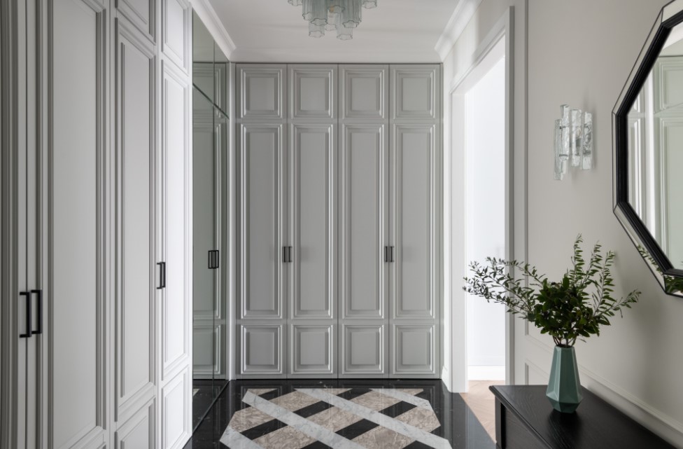 Установите встроенные шкафы с раздвижными дверцами, маленькие полочки для обуви и узкие зеркала. Для того, чтобы визуально расширить пространство, используйте светлые цвета в мебели и настенном покрытии, а также сделайте всё возможное для того, чтобы помещение было как можно лучше освещено (помимо основного источника света можно использовать и второстепенные: бра и точечную подсветку, создавая разнообразные сценарии освещения).