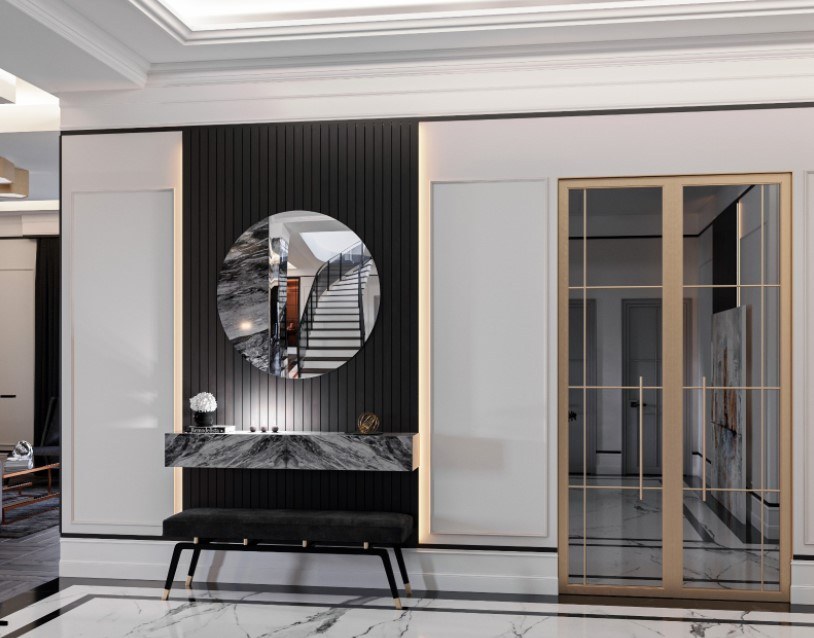 Для прихожей в современном стиле отличным решением станет установка корпусной мебели. Шкафы-купе установите с зеркальными дверцами и подсветкой, а также можно сделать его угловым. Касательно цветовой палитры в современности хорошо выглядят нейтральные оттенки. Используйте белый, чёрный, бежевый, молочный, а также цвет слоновой кости в качестве основных оттенков.