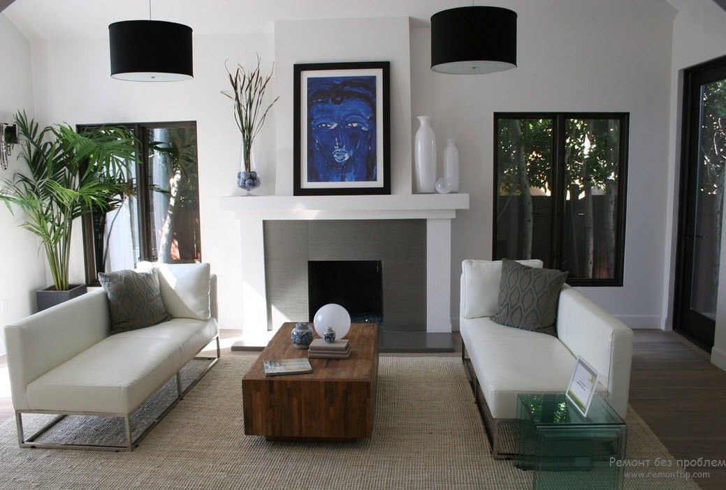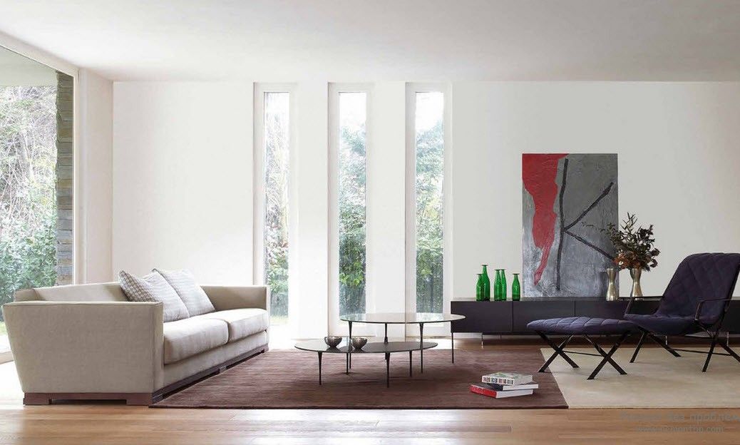 Данный стиль отличает минимальное количество мебели, только строго необходимое, а также, отсутствие декора. Лучше избегать контрастных сочетаний, выбирая цветовую палитру интерьера, т.е. взгляд при виде такой гостиной не должен ни за что цепляться, а только скользить.