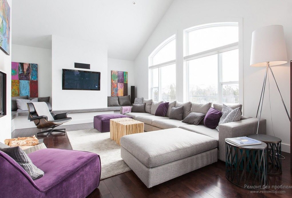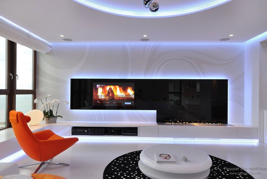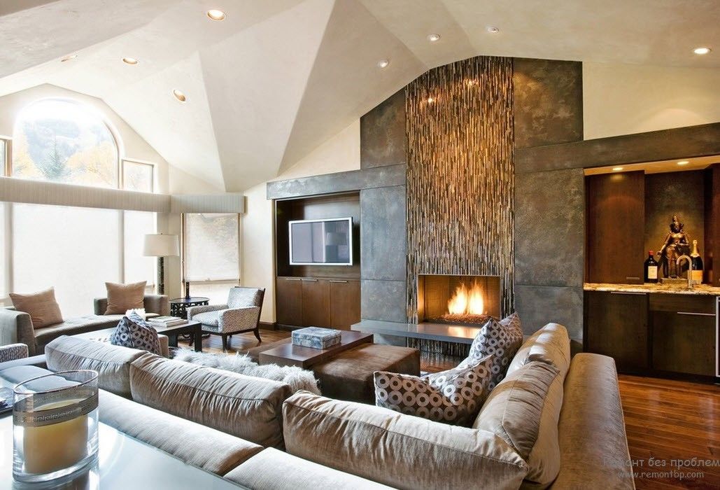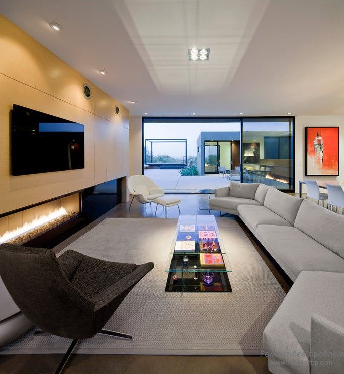Относительно цветовой гаммы – уместны исключительно однотонные, например, белый, серый или металлик, можно использовать бутылочную зелень. Но чаще всего используется светлые оттенки. Центральный акцент гостиной этого стиля – домашний кинотеатр, причем, последней модели, с плазменным экраном во всю стену.