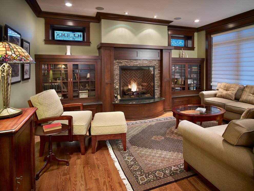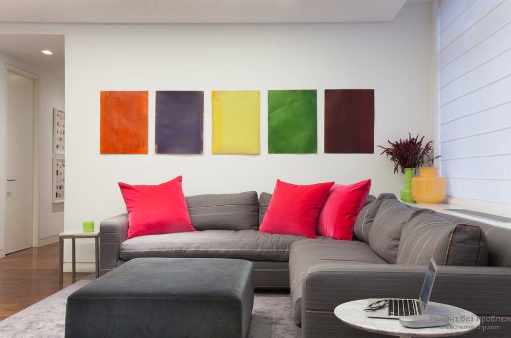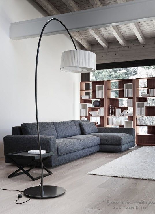Желательно остановить свой выбор на трех необходимых модулях, например, ТВ-тумбе, стеллаже для книг и подставке под диски. Основное требование к мебели – полное исключение какого-либо декора на фасадах шкафов, тумб и пр., т.е. они должны быть абсолютно гладкими (без росписи или резьбы). Относительно мягкой мебели – здесь она геометричная, диваны достаточно жесткие и низкие, чаще всего, прямоугольной формы.