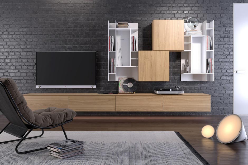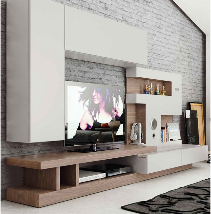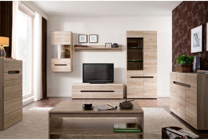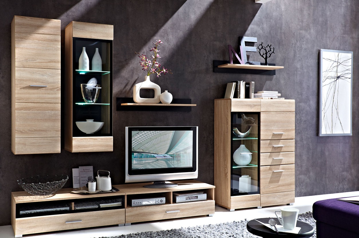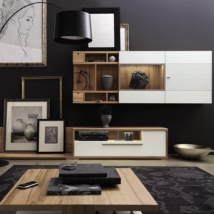 Современные стенки для гостиной светлые, часто также под дерево. Они сильно отличаются от изношенных стеновых блоков прежних лет. Конструкции шкафов и полок ограничиваются необходимым минимумом. Корпусная мебель для гостиной имеет форму прямоугольника и квадрата, включая комоды, которые выполняют как практическую, так и декоративную функцию. Решения, представленные на фото ниже, пользуются наибольшей популярностью.