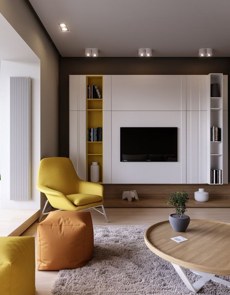 В равной степени интересна и другая, менее важная, но современная мебель для гостиной, например, книжные полки, телевизионные тумбы или книжные шкафы. Поскольку декор ограничен необходимым, хорошо подчеркните минимализм расположения предметов интерьера, их практические функции, включая надежность и емкость, которые выходят на первый план.