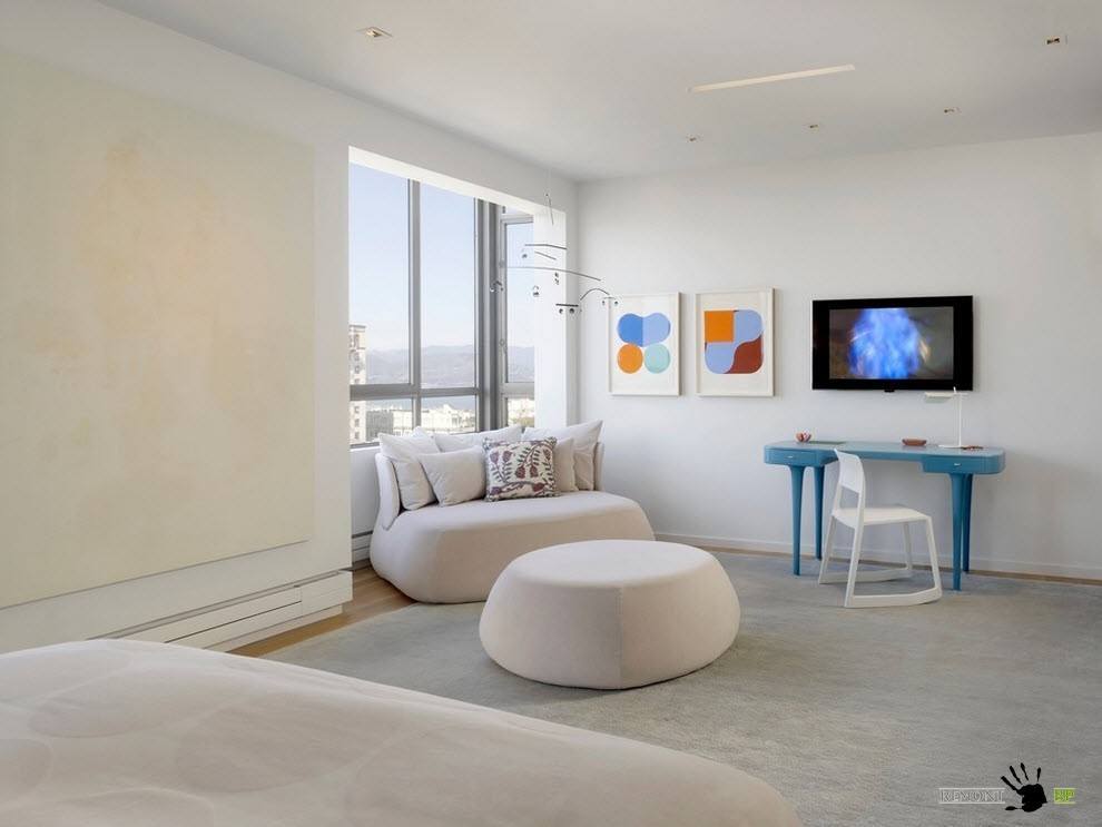 Если пространство спальни позволяет, то можно организовать целую зону отдыха или небольшой будуар в одном из углов комнаты или у окна (в зависимости от формы и размеров помещения). Небольшой диванчик или пара кресел с пуфом-подставкой или невысоким столиком создадут гармоничную и удобную группу.