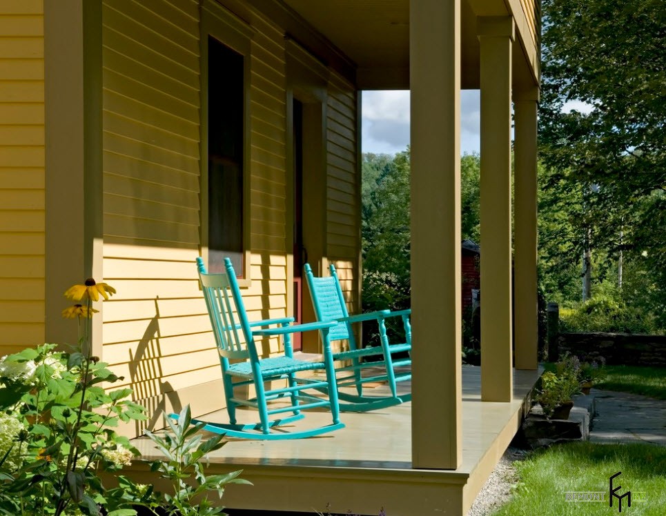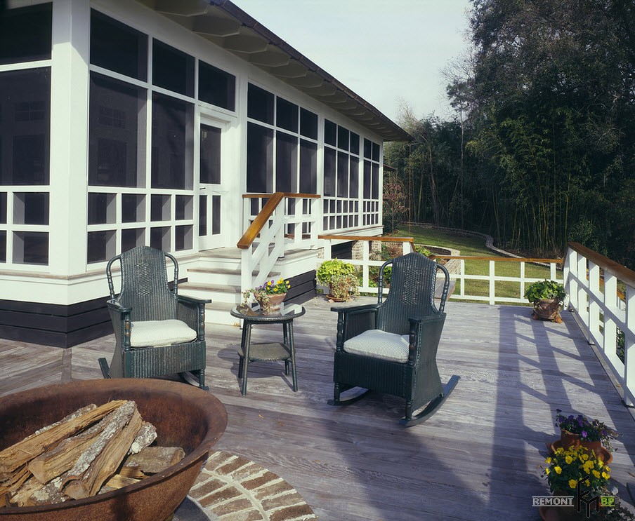 Кресло-качалка на террасе или просторном балконе смотрится очень гармонично. Для расположения под открытым небом обычно выбирают кресла, изготовленные из дерева или ротанга.